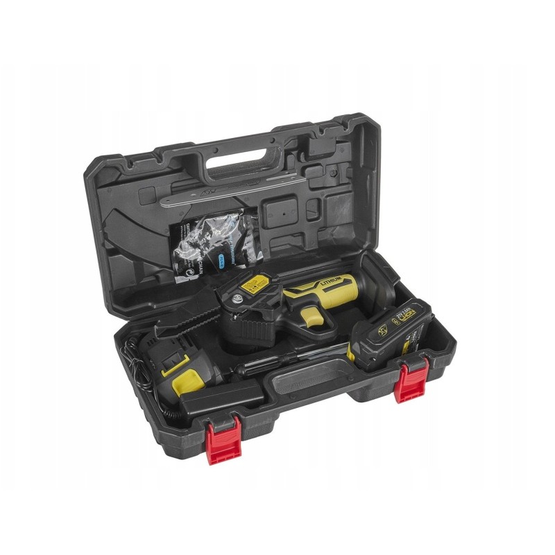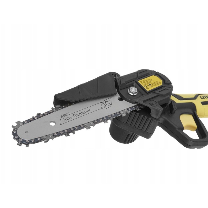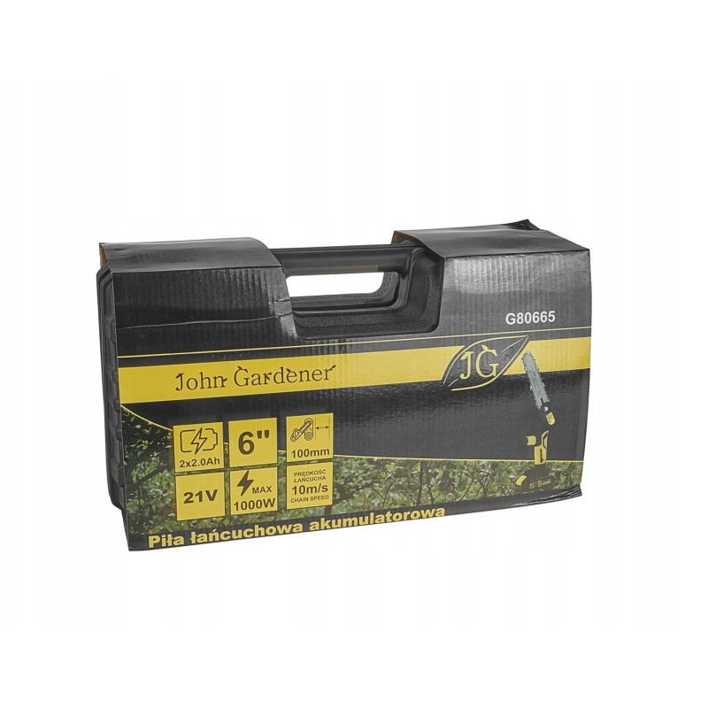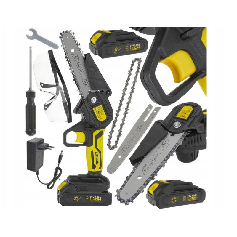 - Lieferumfang: 2x Akku 21 V 2 Ah, Ladegerät, Kette 1/4", Akku-Säge, Führungsschiene 6"