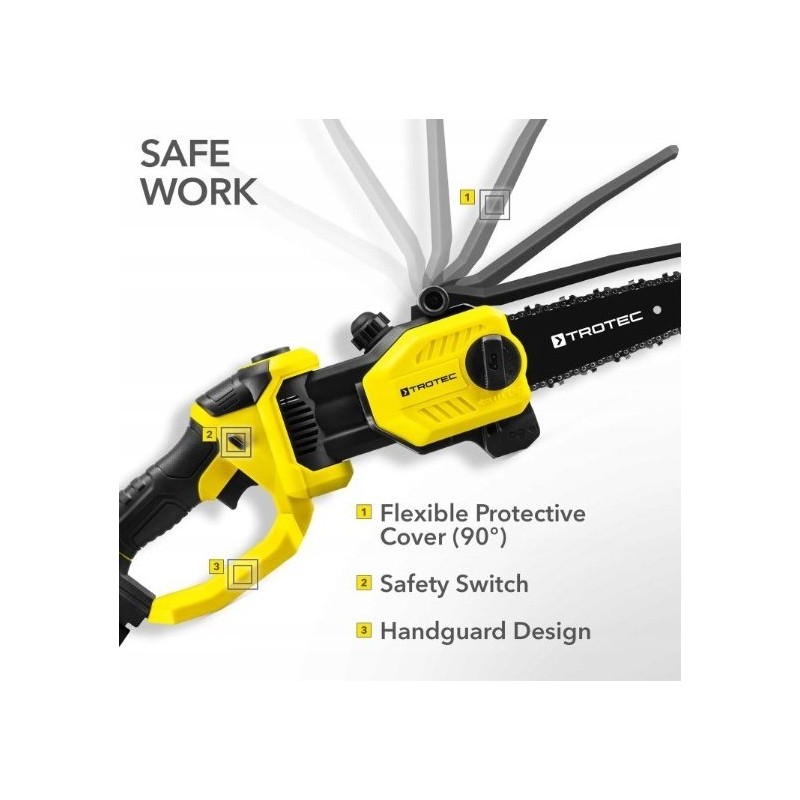 Die Kettensäge PCHS 10-20V ist mit zahlreichen Funktionen für sicheres Arbeiten ausgestattet. Um ein versehentliches Einschalten zu vermeiden, verfügt das Gerät über eine Startschutzsperre im Griff. Der Handschutz schützt beim Sägen vor Ästen. Die Kettensäge verfügt zudem über einen verstellbaren Kettenschutz, der die Schnittseite in jedem Schnittwinkel schützt und eine sichere Aufbewahrung oder den Transport gewährleistet.