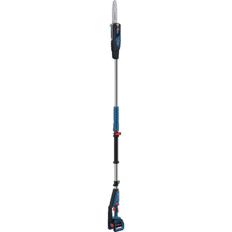 Die Bosch Professional GKE 18V-25 TP ist eine Akku-Astsäge, die Bedienkomfort mit hoher Leistung verbindet. Dank des 2,4 Meter langen Teleskopgriffs ermöglicht sie das Schneiden hoher Äste, ohne dass eine Leiter benötigt wird. Die Säge ist mit einem leistungsstarken, bürstenlosen Motor ausgestattet, der von einem 18-V-Akku angetrieben wird, sowie mit einer 25 cm langen Führungsschiene, was präzise und effiziente Schnitte gewährleistet. Die Geschwindigkeitsregelung ermöglicht die Anpassung an verschiedene Holzarten. Das Kettenspannsystem mit Magnetmutter erleichtert die Wartung, und der Teleskopgriff lässt sich in zwei Teile zerlegen, was Transport und Lagerung erheblich vereinfacht. Die Gesamtlänge des Geräts beträgt 2,9 Meter, die Schnittgeschwindigkeit 7,7 m/s.