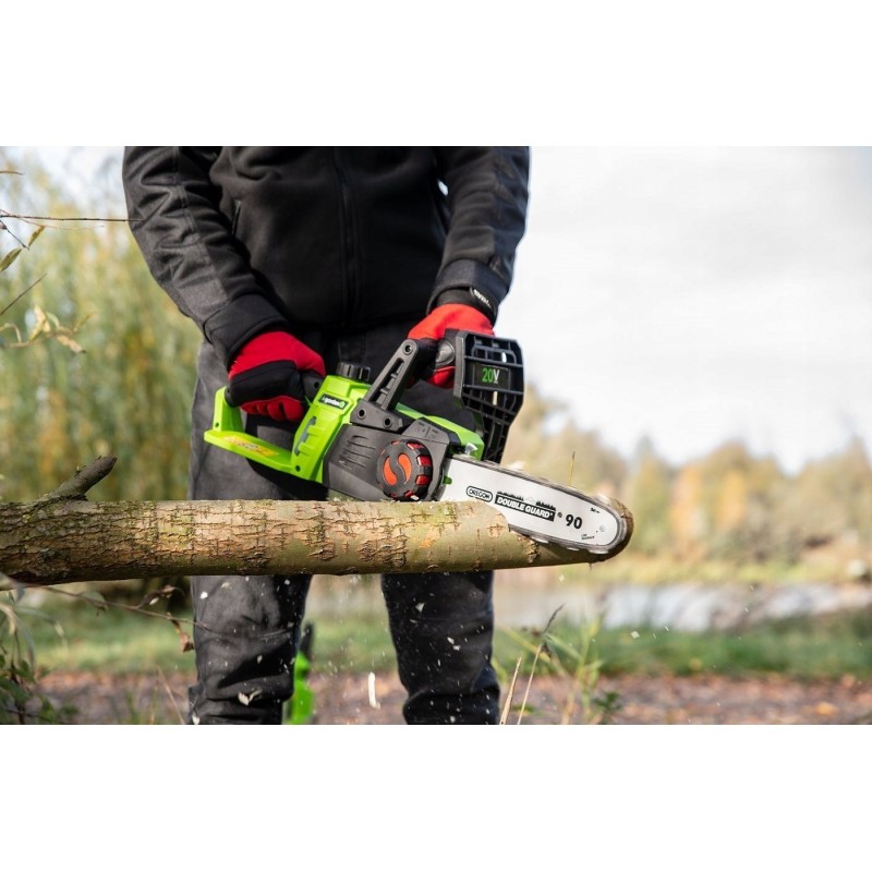 Dank innovativer Technologie lässt sich der Gleichstrommotor des Akkus schnell und einfach starten. Es gibt keine Kabel und keinen Kraftstofftank – ein einziger Handgriff genügt, und die Kettensäge ist im Garten einsatzbereit.