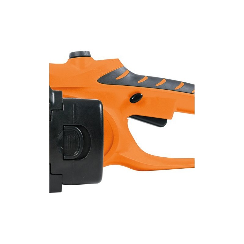 Die Kettensäge verfügt über eine Schutzhaube, die vor Splitterflug schützt. Zudem enthält sie ein Fach für den Inbusschlüssel. Die Schalterarretierung sorgt für sicheres Arbeiten.