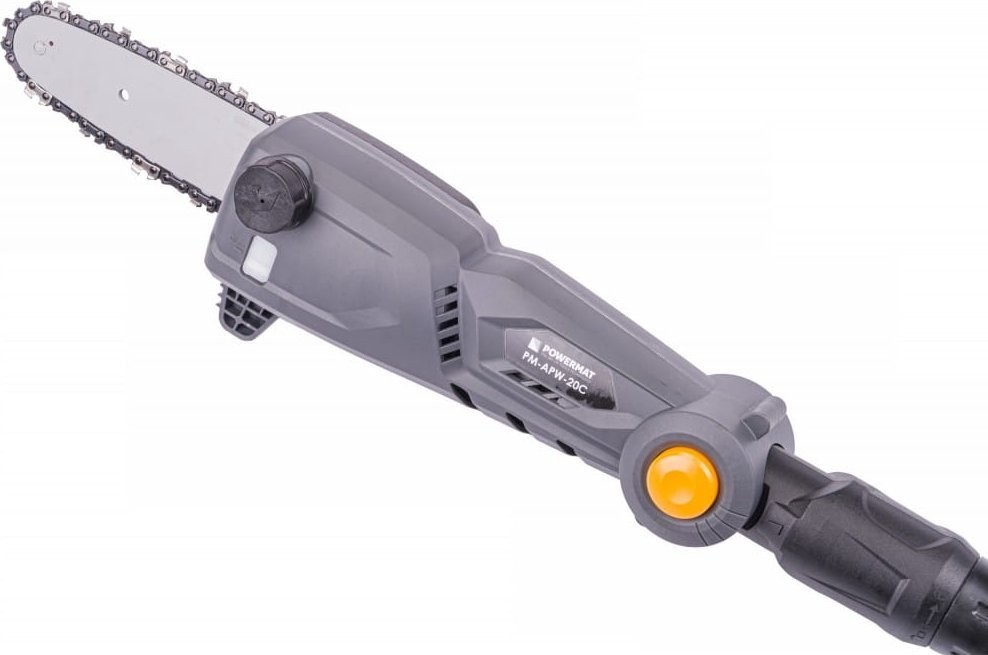 Elektrische Ausleger-Kettensäge mit vierstufiger Neigungsverstellung der Marke POWERMAT PM-APW-20C mit hochwertiger Führungsschiene und Kette der Profimarke OREGON. Die Möglichkeit der schnellen und einfachen Längenverstellung des Auslegers im Bereich von 172 cm bis 240 cm sowie die vierstufige Neigungsverstellung des Sägekopfes erleichtern das Beschneiden von Bäumen erheblich. Der 20-V-Akku-Elektromotor (2 Ah) ermöglicht dank seiner Leistungsreserven das Schneiden dicker Äste. Die Schienenlänge beträgt 20 cm und die Schnittlänge 18 cm. Die Säge ist aus hochwertigen Materialien gefertigt, was für gute Stabilität und damit für weniger Ermüdung bei der Arbeit sorgt. Die Säge verfügt über ein automatisches Kettenschmiersystem. Der Ölstand lässt sich leicht über eine transparente Anzeige überprüfen. Ein großer Vorteil der Säge ist ihr Gewicht von nur 3,25 kg. Die Kettengeschwindigkeit beträgt 5 m/s.