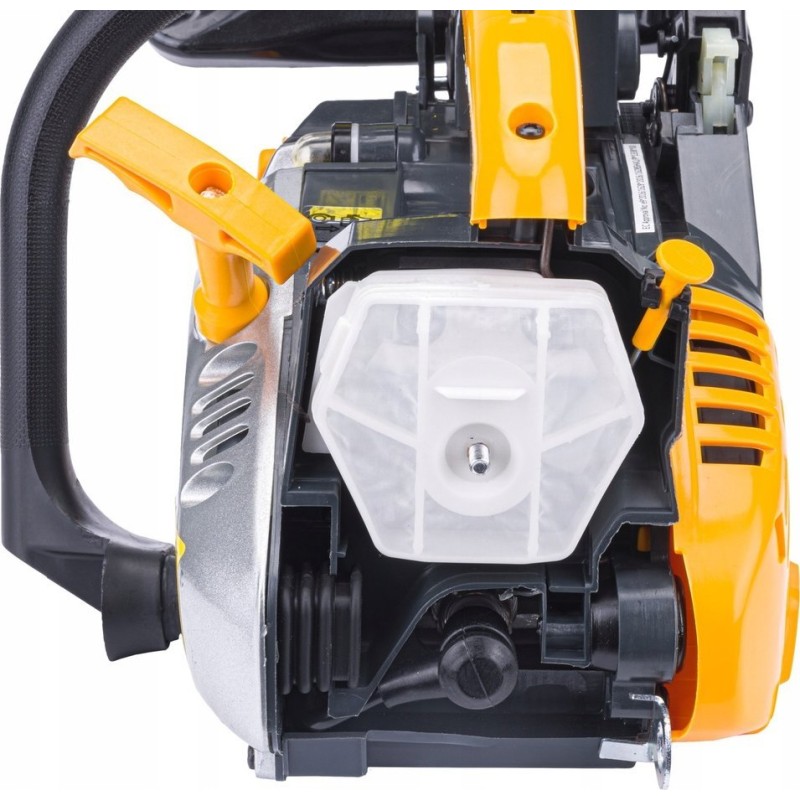 Im Lieferumfang der Kettensäge ist alles enthalten, was Sie für den Arbeitsbeginn benötigen: ein Tank für das Gemisch, ein Schlüsselsatz, eine Feile, ein Schlitzschraubendreher, eine Kette, eine Führungsschiene, eine Führungsschienenschutzabdeckung sowie drei Flaschen Öl für das Gemisch mit einem Fassungsvermögen von jeweils 100 ml. Die Bedienungsanleitung in polnischer Sprache erleichtert den Einstieg in die Nutzung.