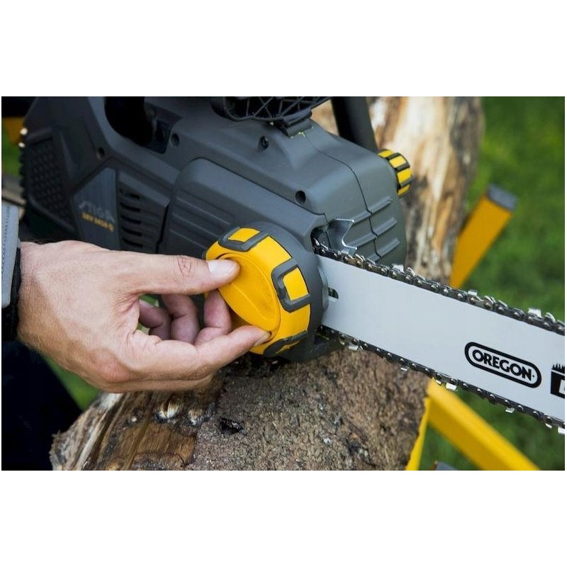 Die hohe Leistung der Säge in Kombination mit einer Führungsschiene von 40 cm Arbeitslänge und einer Sicherheitsbremse