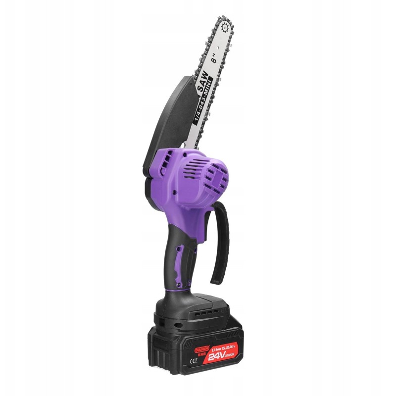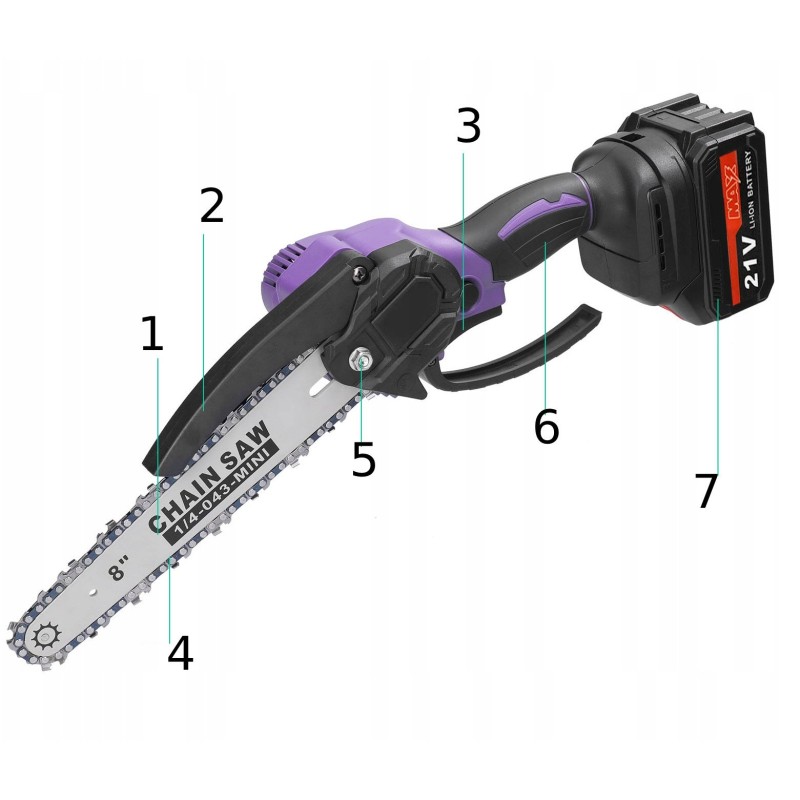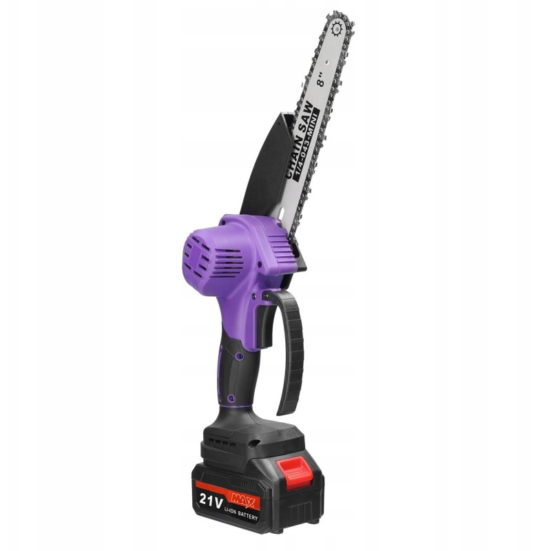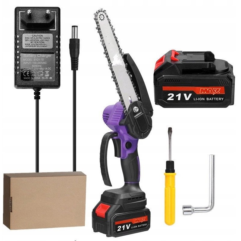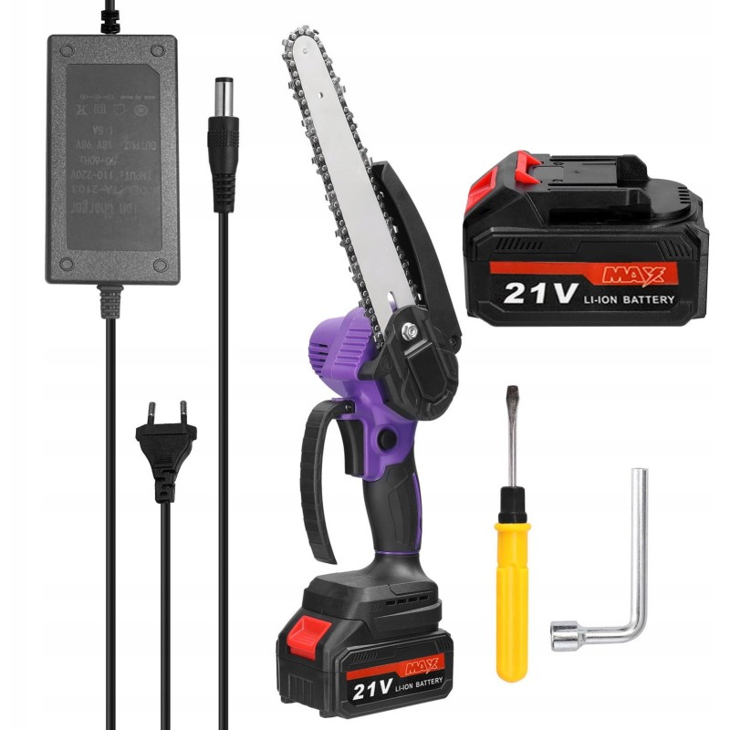 - Lieferumfang: Kettensäge, Kette mit 8-Zoll-Kopf, 2x Akku, Ladegerät, Splitterschutz, Schraubendreher, Schlüssel, Bedienungsanleitung in polnischer Sprache.