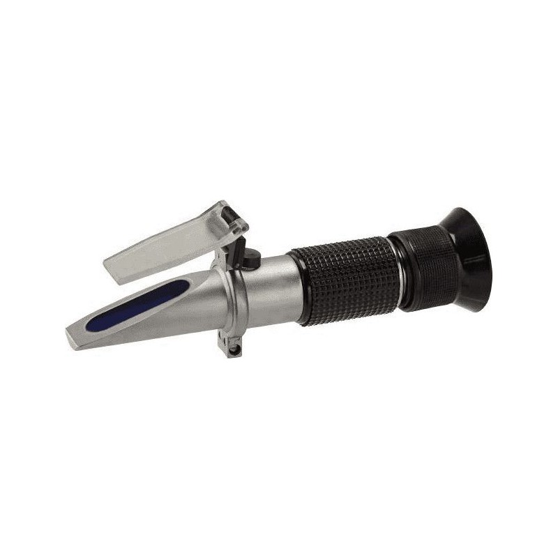 Handrefraktometer zur einfachen Überprüfung des Gefrierpunkts von Kühl- und Schmierflüssigkeiten sowie Scheibenwaschflüssigkeiten, außerdem zur Überprüfung des Elektrolyts zur Feststellung des Batteriezustands. Zur Kontrolle sowohl von Ethylenglykol als auch von Propylenglykol. Es handelt sich um ein optisches Messgerät, mit dem sich die Konzentration der Flüssigkeit durch Messung ihres Brechungsindexes sehr einfach und schnell bestimmen lässt. Öffnen Sie den Deckel und geben Sie 2–3 Tropfen der Flüssigkeit auf den Prisma. Richten Sie den vorderen Teil des Refraktometers auf eine Lichtquelle, stellen Sie die Schärfe mit Hilfe des Okulars ein und lesen Sie den Wert ab. Einfache Kalibrierung und Einstellung.