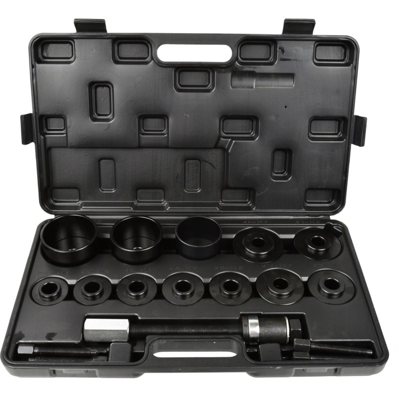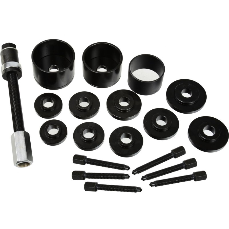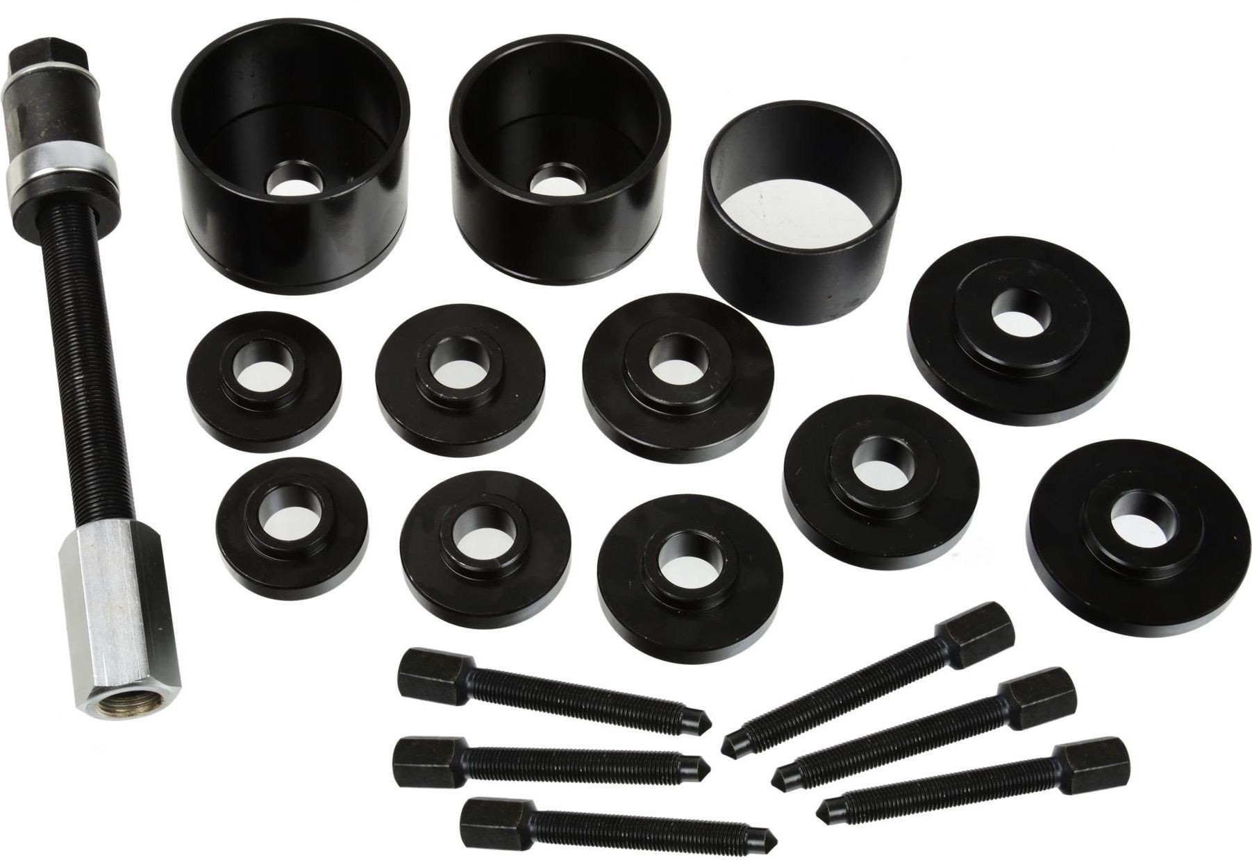 Satz zum Ein- und Ausbau von Vorderradnabenlagern direkt am Fahrzeug mithilfe einer gelagerten Abziehschraube. Produkteigenschaften: Für den Einsatz mit hydraulischen und mechanischen Pressen geeignet; der Abzieher ermöglicht die Demontage von Lagern, Metall-Gummi-Buchsen und Vorderradnaben. Lieferumfang: Abziehschraube mit Lagerung, Länge 275 mm; 9 Adapter mit Außendurchmesser 55,5 – 59 – 62 – 65 – 66 – 71,5 – 73 – 78 – 84 mm 3 Hülsen: 73 – 86 – 91 mm Nabenbolzen: M12 x 1,5 – 3 Stück, M14 x 1,5 mm – 3 Stück