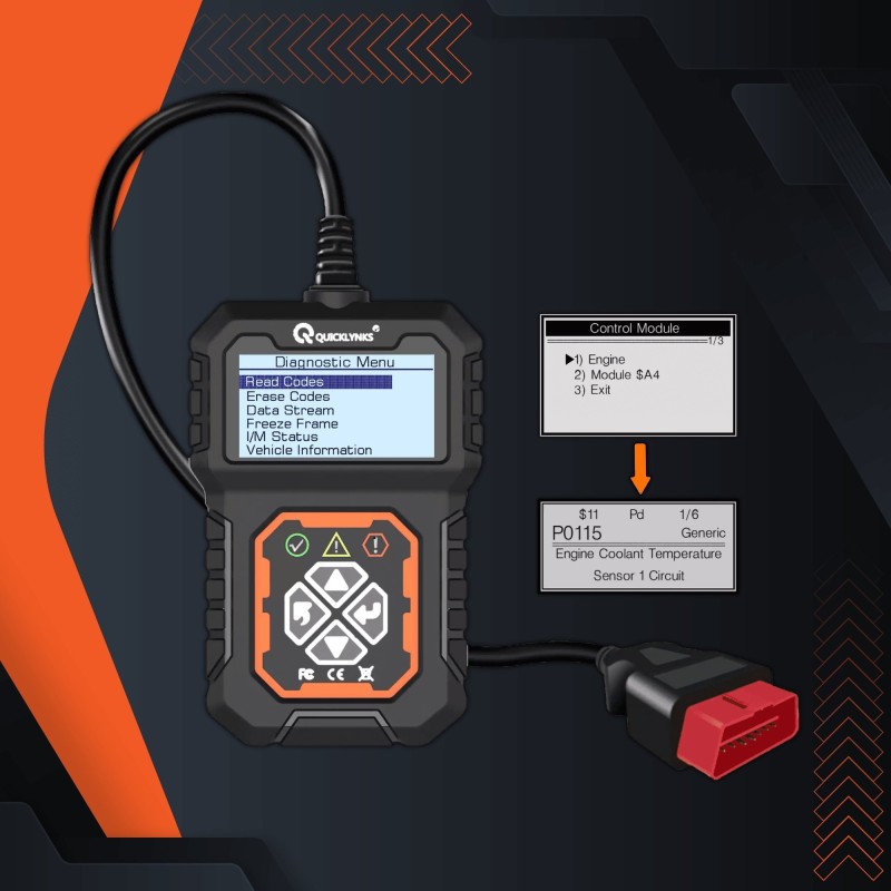 - CODE-AUSLESEN – Liest Fehler aus dem Motorsteuergerät des Fahrzeugs aus und zeigt eine kurze Beschreibung auf dem LCD-Bildschirm an