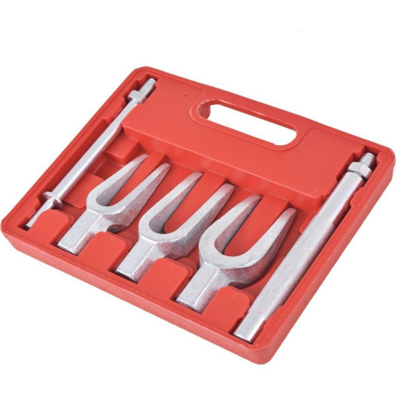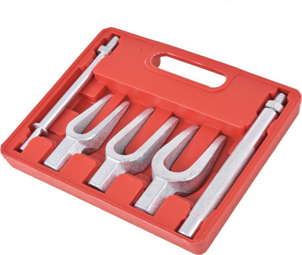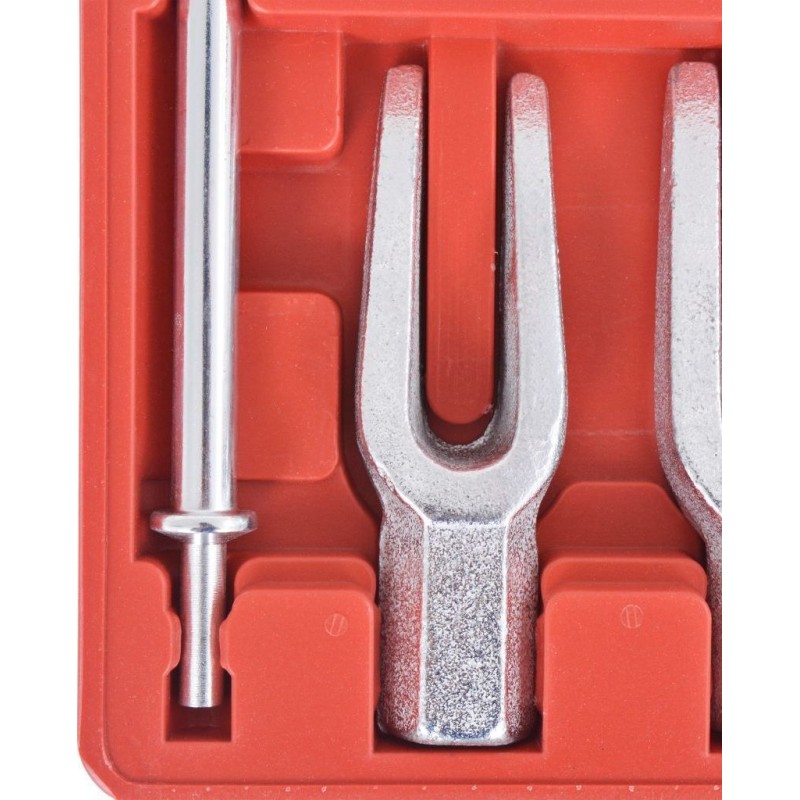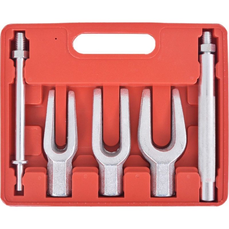 Der Kugelgelenk-Abzieher ist für den manuellen Einsatz sowie in Verbindung mit Druckluftsystemen zum Abziehen von Kugelgelenken, Getriebearmen und Spurstangen vorgesehen. Das Set enthält außerdem Adapter für den Drucklufthammer, die zum Abziehen und Einbau des oberen und unteren Kugelgelenks im Fahrzeug erforderlich sind.