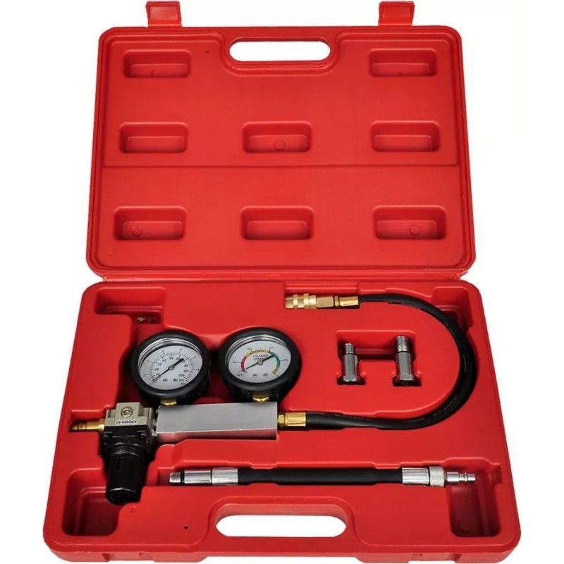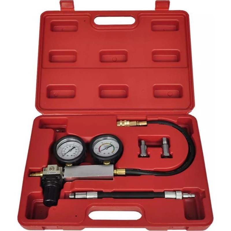 Das Set zur Erkennung von Undichtigkeiten im Motorinneren diagnostiziert schnell Probleme wie Kolbenringe, Ventile und Zylinderkopfdichtungen. Die beiden Manometer, deren Schläuche mit einer Gummiummantelung versehen sind, zeigen den Druck von 0 bis 100 psi an und messen die Leckage in Prozent in 5-Prozent-Schritten. Sie sind sehr einfach abzulesen, präzise und für korrekte Messungen ausgelegt.