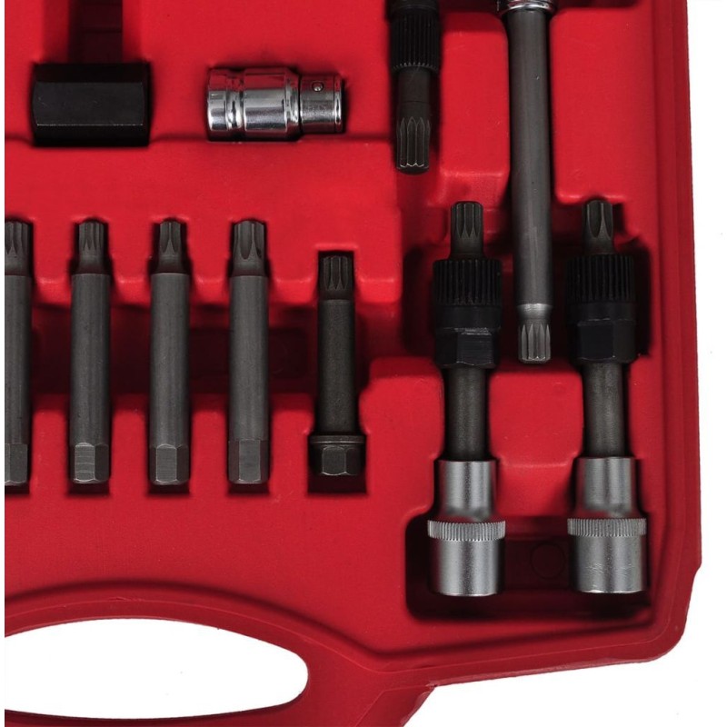 Dieses Set zur Reparatur und zum Ausbau der Lichtmaschinenriemenscheibe enthält verschiedene Adapter, die für alle gängigen Marken geeignet sind, darunter eine vollständige Auswahl an TRX-, Spline- und Sechskant-Adaptern, die für die meisten Lichtmaschinen passen.