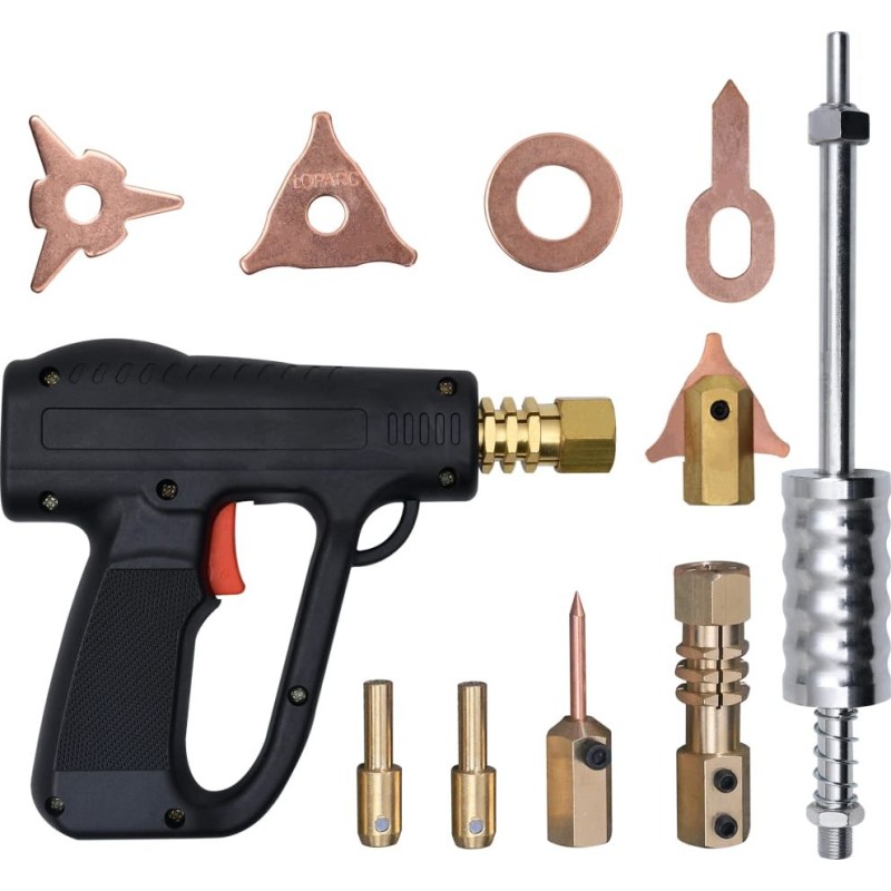 Mit diesem Set mit Heißluftpistole lassen sich Beulen in der Karosserie effektiv beseitigen. Es ist das ideale Werkzeug für professionelle Kfz-Werkstätten und Lackierbetriebe oder für die Heimwerkstatt. Dieses Set mit Heißluftpistole enthält 20 Teile, mit denen Sie eine Vielzahl von Schäden an Ihrem Fahrzeug beheben können. Der Schwunghammer besteht aus Kohlenstoffstahl und wird auf die Karosserie aufgesetzt, damit der Puller Dellen effektiv und mühelos herausziehen kann. Der robuste Kopf mit Dreiecksform ermöglicht dank der hohen Zugkraft des Hammers das Herausziehen selbst großer Dellen. Sie können bei der Karosseriereparatur Zeit und Geld sparen, indem Sie dieses benutzerfreundliche Autoreparaturwerkzeug direkt einsetzen.Material des Schwunghammers: KohlenstoffstahlLänge des Schwunghammers: 36 cmLieferumfang:1 x Schwunghammer 1 x Halterung für Kohlenstoffstange 1 x Schweißspitze 3 x dreieckige Platte 3 x OT-Spitze 4 x runde Spitze 1 x Halterung mit Dreieck 1 x Halterung für runde Spitze 1 x Punktschweißpistole 3 x Halterung für blumenförmige Spitze 1 x Halter...