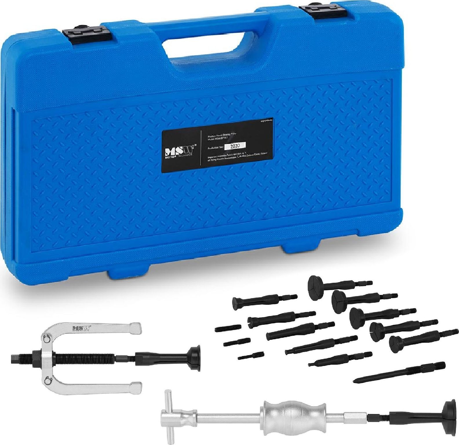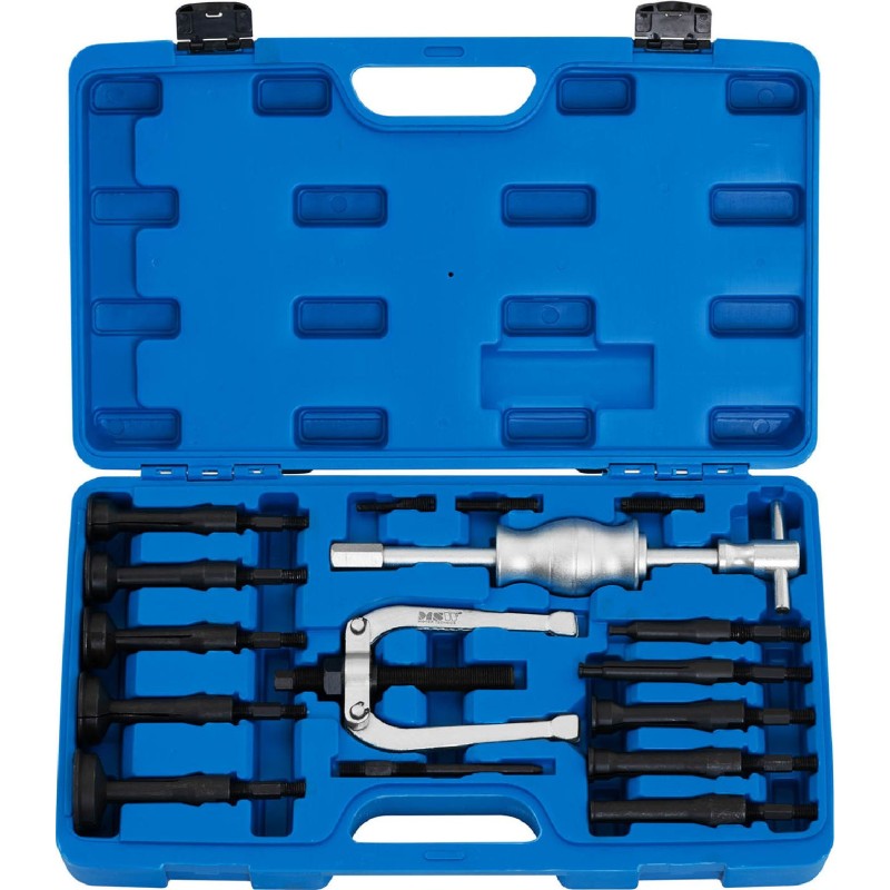 – Abzieherhalterung, – Trägheitshammer, – Gewindeadapter M10 x 1,5, - Gewindeadapter M10 x 1,5 auf M8 x 1,25, - Gewindeadapter M10 x 1,5 auf M8 x 1,25, - Gewindeadapter M10 x 1,5 und M6 x 1,0, - Spreizabzieher: 8–11 mm, 12–17 mm, 18–23 mm, 24–29 mm, 30–34 mm, 34–38 mm, 39–43 mm, 44–48 mm, 49–53 mm, 54–58 mm, - Koffer, - Bedienungsanleitung.