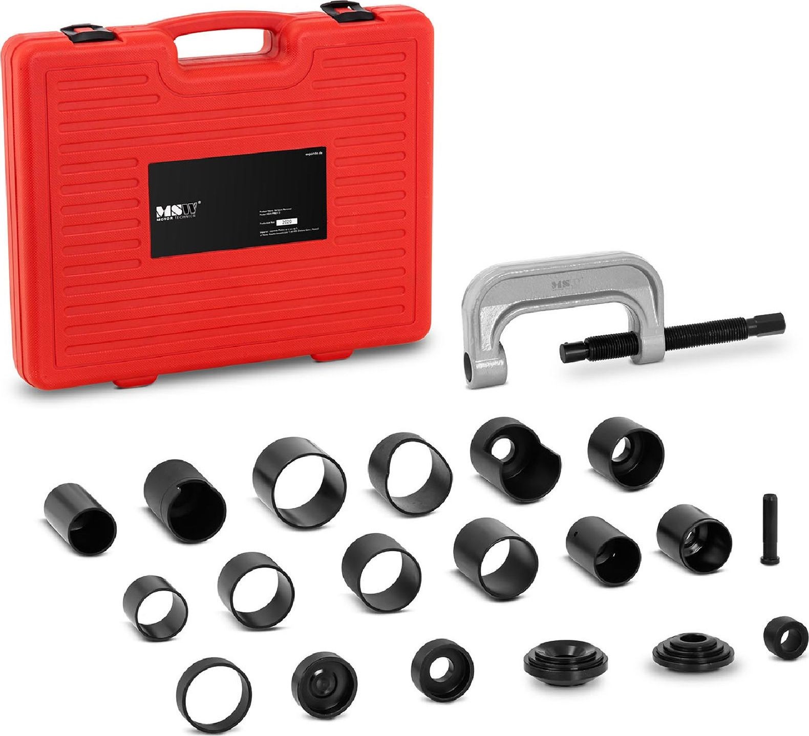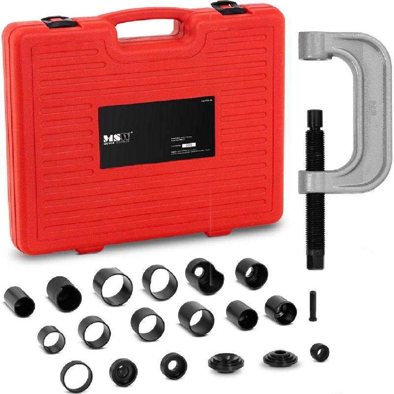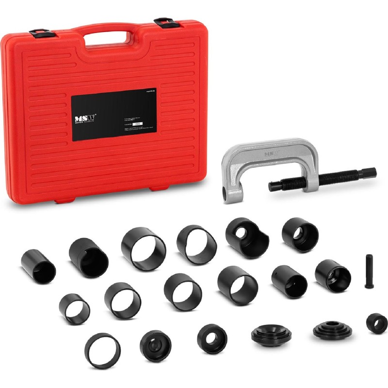 Der Kugelbolzenabzieher der Marke MSW ist ein Zubehörteil für den professionellen Einsatz in Kfz-Werkstätten, Autowerkstätten, Garagen usw. Das Set besteht aus einer Schraube mit M25-Schaft (Länge 27 cm) sowie zahlreichen funktionalen Aufsätzen. Dank dieser Aufsätze kann das Werkzeug zum Aus- und Einbau von Kugelgelenken in Fahrzeugen der Marken Ford (Vans, SUVs und leichte Lkw bis 2003), Dodge (leichte Lkw bis 1998, Durango und Dakota bis 2003), Honda (Accord, Civic, del Sol und Prelude bis 2001) sowie vieler anderer europäischer Marken (Transporter- und SUV-Modelle) verwendet