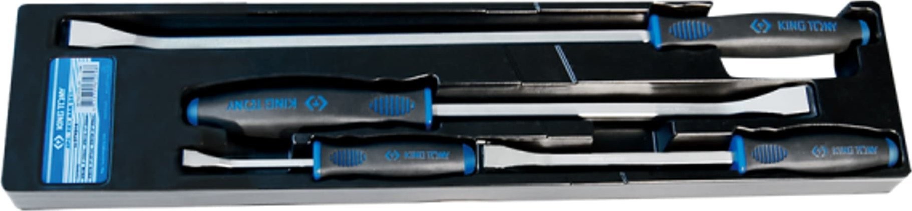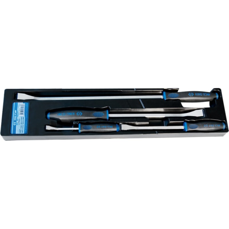 4-teiliges Montagehebel-Set King Tony 9TK014. Das Set enthält 4 Montagehebel aus hochwertigem, gehärtetem und vergütetem Chrom-Vanadium-Legierungsstahl mit folgenden Gesamtlängen: 204 mm, 312 mm, 458 mm, 608 mm. Der ergonomische Griff besteht aus PP+TPR-Kunststoff. Diese Werkzeuge sind bei vielen Montage- und Demontagearbeiten sehr nützlich und dienen zum Hebeln von Bauteilen.