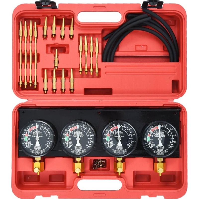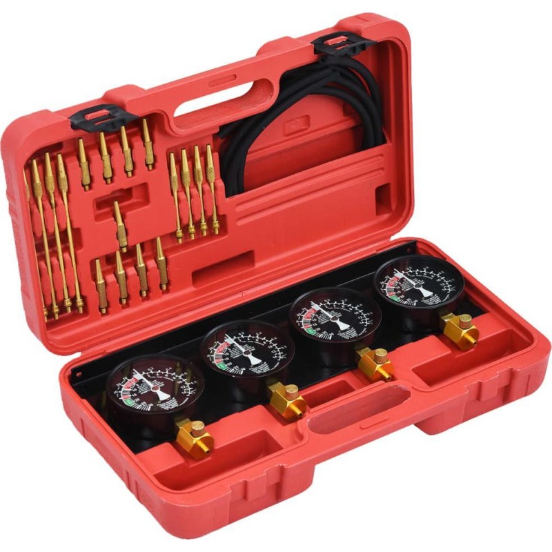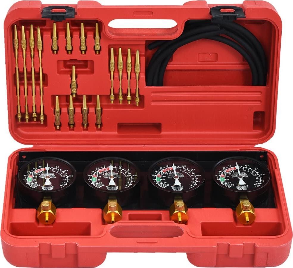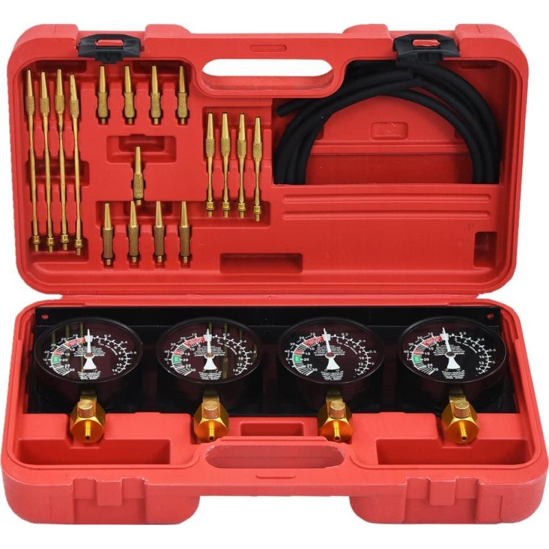 Mit diesem Set lassen sich die Werte von 4 Vergasern synchronisieren und einstellen. Jedes Messgerät verfügt über ein eigenes Drosselventil und eine eigene Kalibrierung.