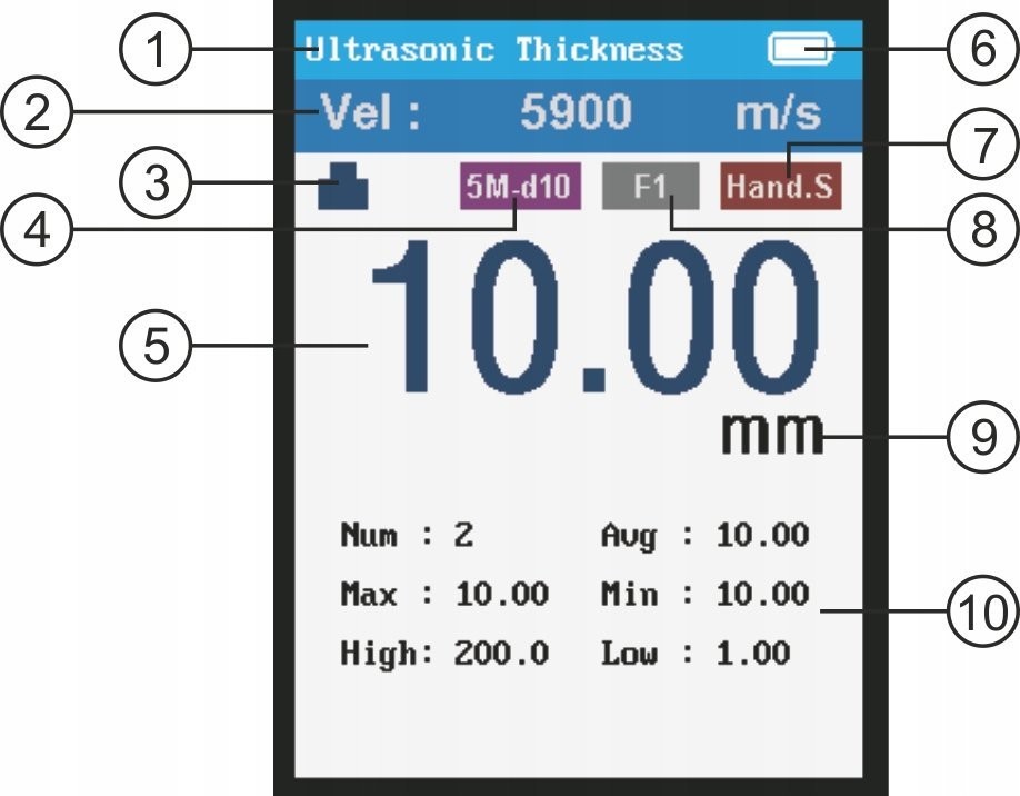 Mit dem Gerät kann die Dicke jedes Materials gemessen werden, das Ultraschallwellen gut leitet und dessen Ober- und Unterseite parallel zueinander sind, z. B. Metall, Kunststoff, Keramik und Glas, Aluminium, Kupfer, Gold, Harz, Wasser, Glyzerin usw., mit Ausnahme von Gusseisen, dessen Moleküle zu groß sind.