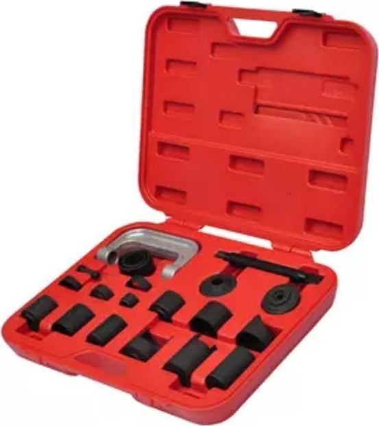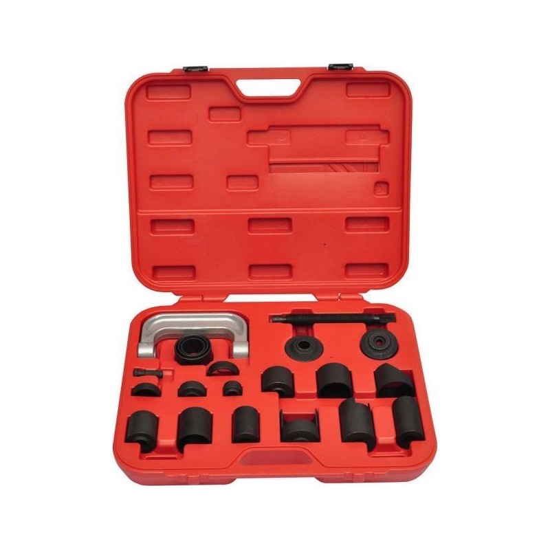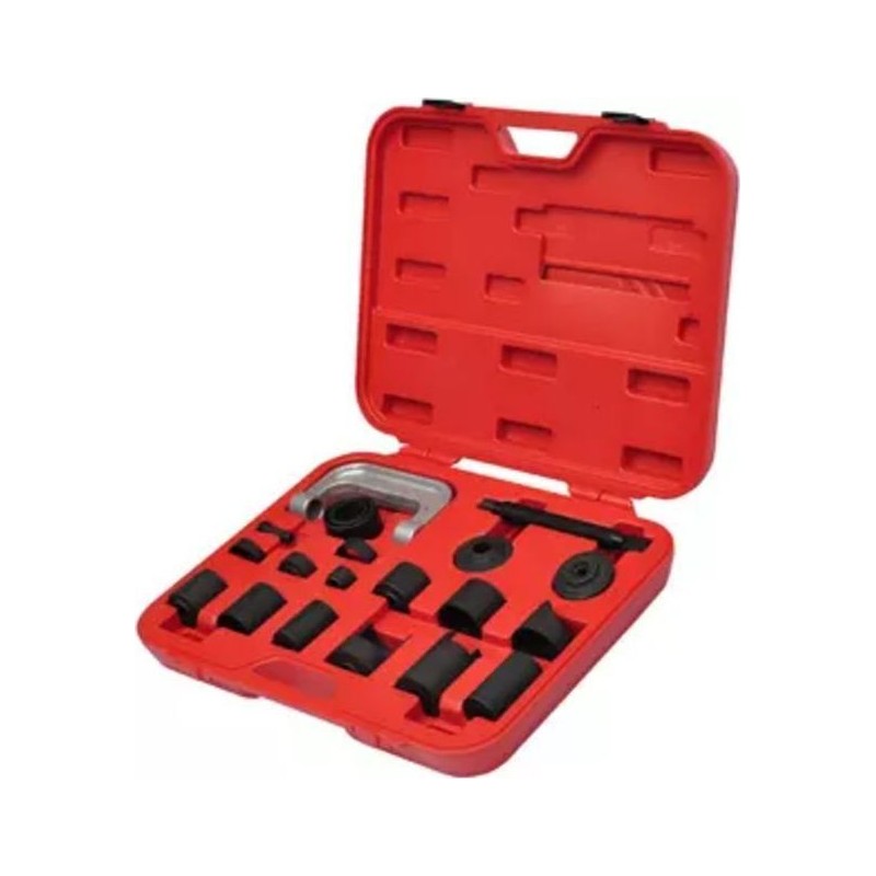 Dieses 21-teilige Set zur Reparatur von Aufhängungsbuchsen ist sehr stabil und wurde aus hochwertigen Materialien gefertigt, die eine lange Lebensdauer gewährleisten. Es eignet sich zum Einpressen von Kugellagern und zur einfachen Montage oder Demontage der Aufhängungsbuchsen am Querlenker. Das Set enthält alle notwendigen Hülsen und Adapter, um die Kugelgelenkbuchse zu wechseln. Zum Lieferumfang gehört auch ein roter Koffer, der die Aufbewahrung und den Transport erleichtert.