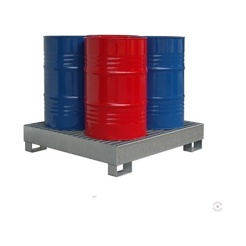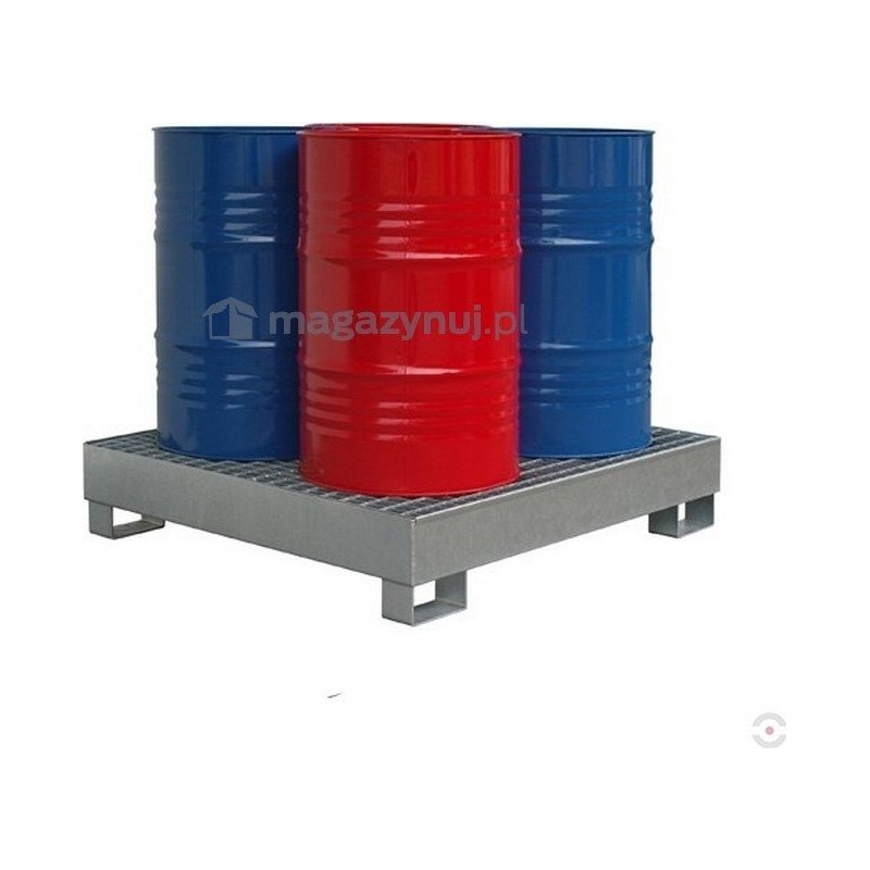 Topserw-Auffangwanne, aus verzinktem Stahl, zur Lagerung von 4 Fässern mit einem Fassungsvermögen von je 200 l sowie von Behältern mit brennbaren Flüssigkeiten (Benzin, Lösungsmittel usw.). Dient zur dauerhaften Auffangung von Leckagen aus Behältern und Fässern, die innerhalb von Gebäuden gelagert werden.