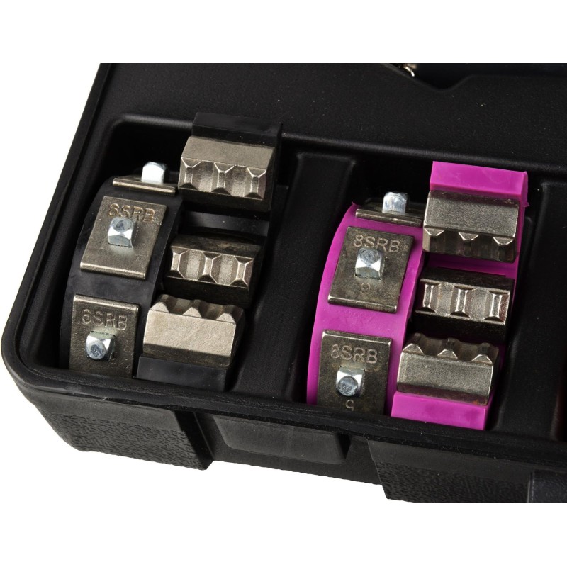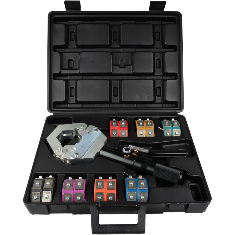 A/C-Presswerkzeug für Klimaschläuche Das Presswerkzeug für Klimaschlauchenden ist ein sehr nützliches, einfaches Werkzeug für Werkstätten, die sich mit der Reparatur von Fahrzeugklimaanlagen befassen. Das Presswerkzeug ermöglicht ein schnelles, einfaches und präzises Verpressen der Schlauchenden. Im Lieferumfang sind neben der Presszange auch Pressbacken (Matrizen) für Schläuche mit verschiedenen Durchmessern enthalten. Das gesamte Set wird in einem robusten und formschönen Koffer geliefert, sodass es sowohl in der Werkstatt als auch im Außendienst eingesetzt werden kann. Geeignet für die folgenden Pressgrößen: 6SRB (5/16"), 8SRB (13/32"), 10SRB (1/2"), 12SRB (5/8") Reduzierklemmen für die oben genannten Durchmesser 6SRB, 10SRB, 12SRB (für japanische Fahrzeuge). Lieferumfang: Handhydraulikpumpe, Spannbacken, Schlauchmatrizen, Reduzierklemmen, Koffer