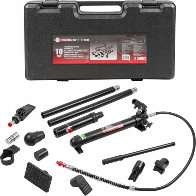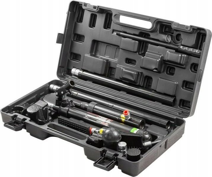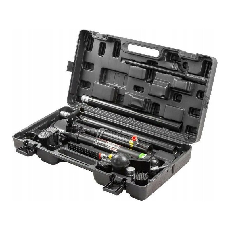Das Set enthält eine Hydraulikpumpe, Zylinder, Verlängerungen und gebogene Aufsätze. Es kann zusätzlich mit einem Hydraulikzylinder mit umgekehrter Wirkung sowie Befestigungsaufsätzen ergänzt werden.