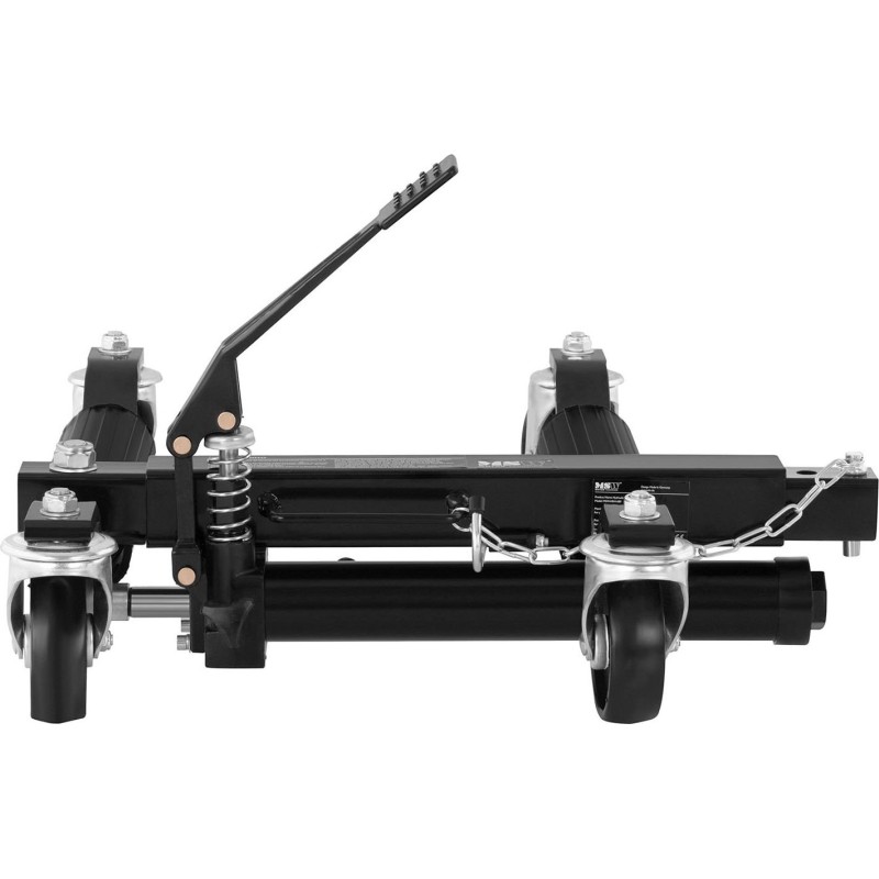 - Leistung – hydraulischer Hebemechanismus (von 380 bis 660 mm), - Belastbarkeit – robuste Konstruktion mit einer maximalen Tragkraft von bis zu 680 kg, - Komfort – vier Lenkrollen, Steuerung über Fußpedal, - Sicherheit – Mechanismus zur Arretierung des Fahrzeugs in der richtigen Position sowie Sicherung des Bolzens mit Kette und Haken zur Arretierung des Pedals, - Mobilität – geringes Gewicht und kompakte Abmessungen erleichtern den Transport des Sets, - Vielseitigkeit – kann unter ein platten oder beschädigtes Rad (einschließlich Reifen mit einer Breite von bis zu 30 cm), eine Schwelle, einen Motor, einen Querlenker oder einen Schlitten geschoben werden. Im Lieferumfang enthalten: