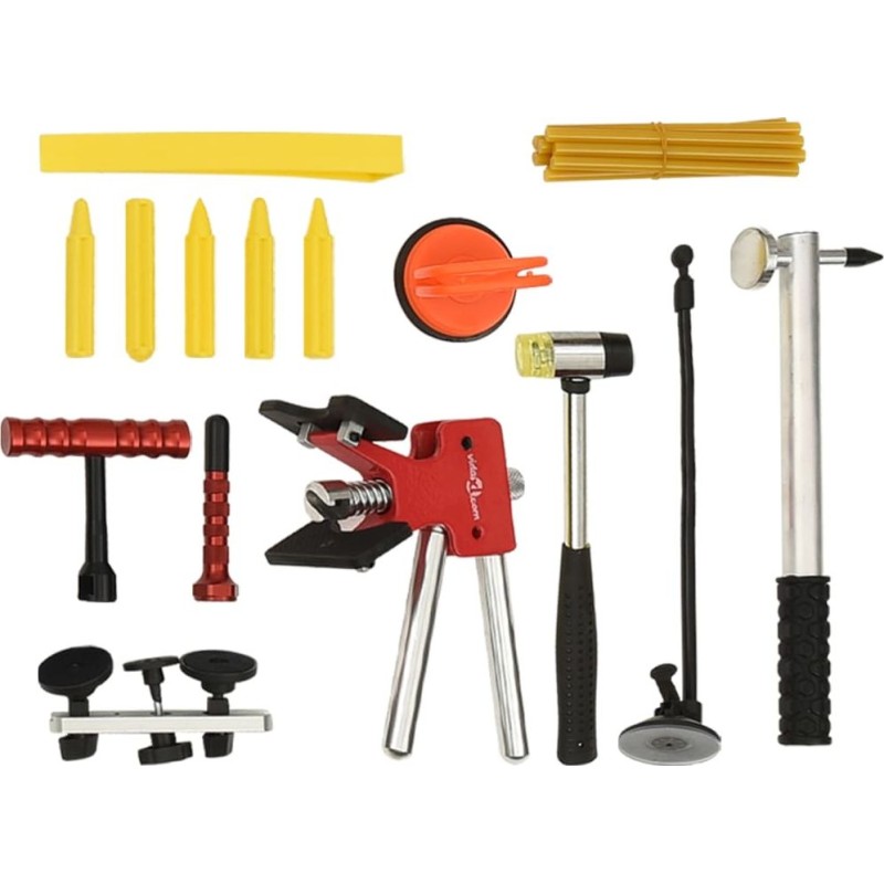 Das Autoreparatur-Set enthält Saugnäpfe in vielen verschiedenen Größen, die für die meisten Dellen und Hagelschäden geeignet sind. Der Schwunghammer aus Edelstahl bietet mehr Kraft zum Ausbeulen und bewältigt auch größere Dellen. Der modernere Puller und die Zugstange eignen sich für kleine und mittlere Dellen. Das Verfahren zur Dellenentfernung, bei dem die Dellen effektiv und sicher herausgezogen werden, schützt den Autolack. Die LED-Reflexionsplatte dient zur Überprüfung von Dellen auf flachen Metalloberflächen. Das eigenständige Ausbeulen von Dellen ohne Lackieren ist die kostengünstigste Methode zur Reparatur von Karosseriedellen, Hagelschäden, Dellen im Motorradtank usw.