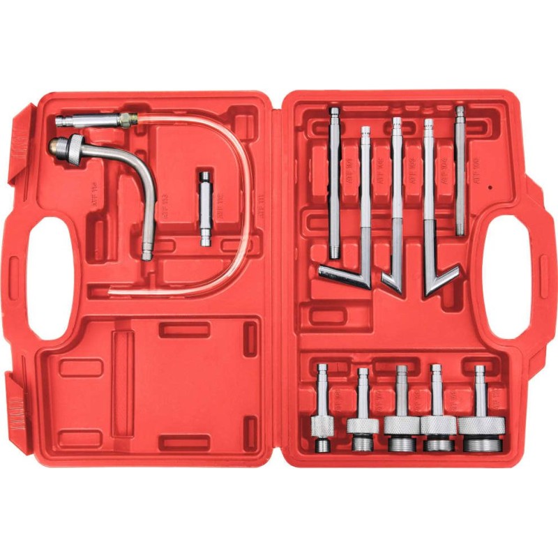 Dieses pneumatische ATF-Befüllsystem zeichnet sich durch professionelle Verarbeitung, stabile Leistung, Langlebigkeit und Zuverlässigkeit aus. Es verfügt über eine Rücklauf-Funktion für Getriebe mit Überlauföffnung. Im Lieferumfang enthalten sind 13 ATF-Adapter mit unterschiedlichen Auslasswinkeln und Gewinden, die mit Fahrzeugen von Ford, Mercedes, VW, Audi, Porsche, Skoda und anderen Marken kompatibel sind. Darüber hinaus sind alle Adapter in einem robusten Kunststoffkoffer übersichtlich angeordnet, was eine lange Lebensdauer im täglichen Werkstattbetrieb gewährleistet.