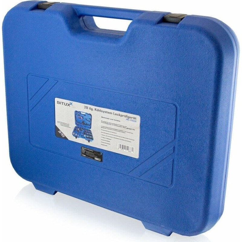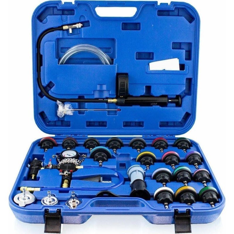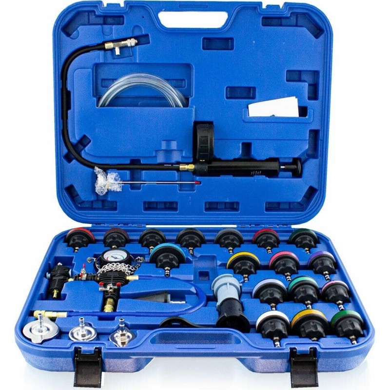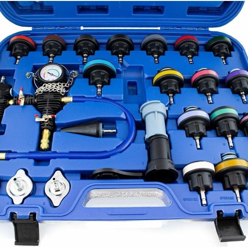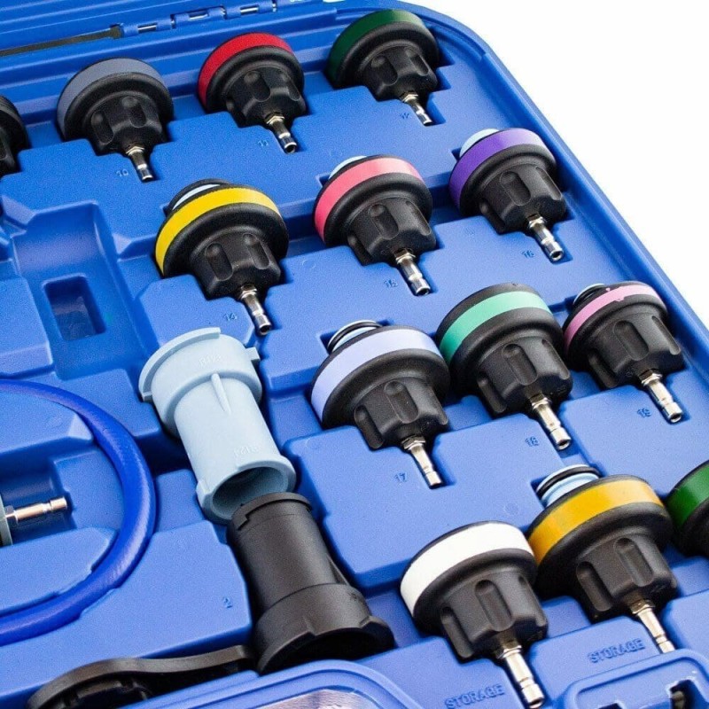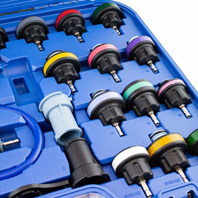 Umfassendes 28-teiliges Testset zur Dichtheitsprüfung des Kühlsystems.