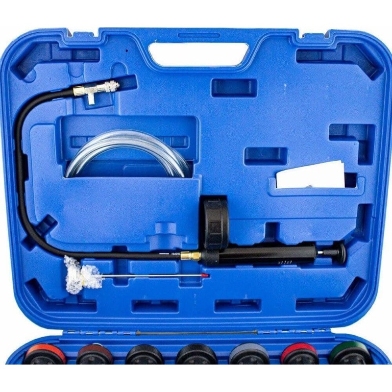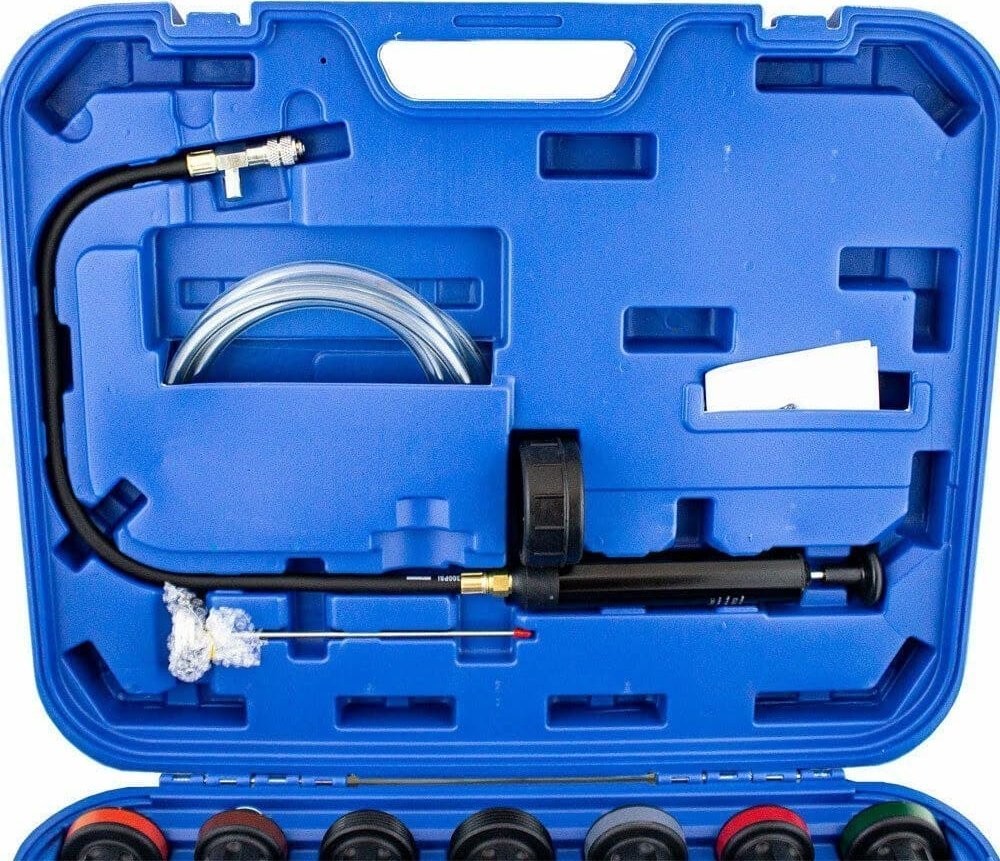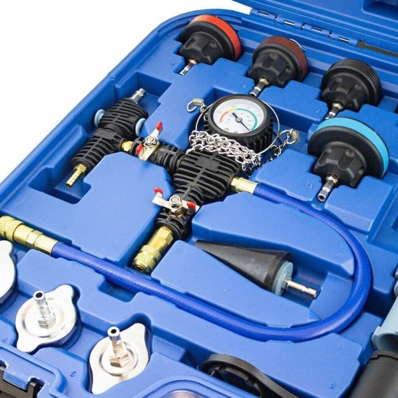 Einfaches und unkompliziertes Kühlsystem-Prüfset, bestehend aus einem Manometer mit Pumpe, einem Einfüllstutzen und verschiedenen Adaptern für verschiedene Fahrzeugmodelle.