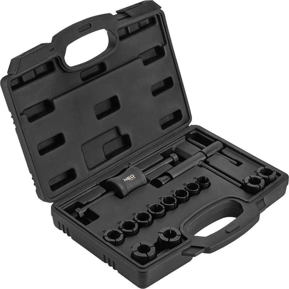 Werkzeugsatz für Bremskolben an Motorrädern, ermöglicht die Demontage festsitzender (festgebackener) Bremskolben; im Lieferumfang enthalten: Schwunghammer, 12 Adapter in den Größen 19–30 mm;