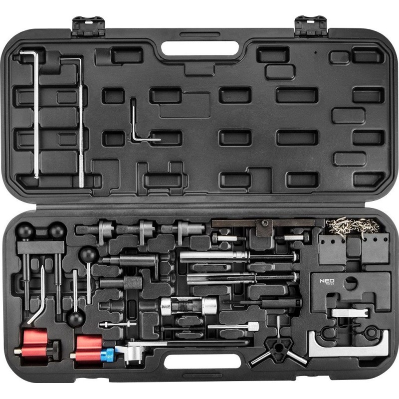 Satz zur Arretierung der Nockenwellen für Benzin- und Dieselmotoren der VAG-Gruppe NEO – Werkzeugsatz zum Arretieren der Nockenwellen bei Fahrzeugen der VAG-Gruppe. Der Satz enthält Teile zur Arretierung der Nockenwellen bei Benzin- und Dieselmotoren. Er enthält die grundlegenden Werkzeuge zum Einstellen und Arretieren des Motors. Der Satz ist in einem Koffer verpackt.