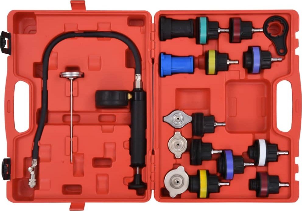 Mit diesem Werkzeugset lässt sich der Druck im Kühlsystem leicht überprüfen und es können Undichtigkeiten im Wassertank aufgespürt werden.