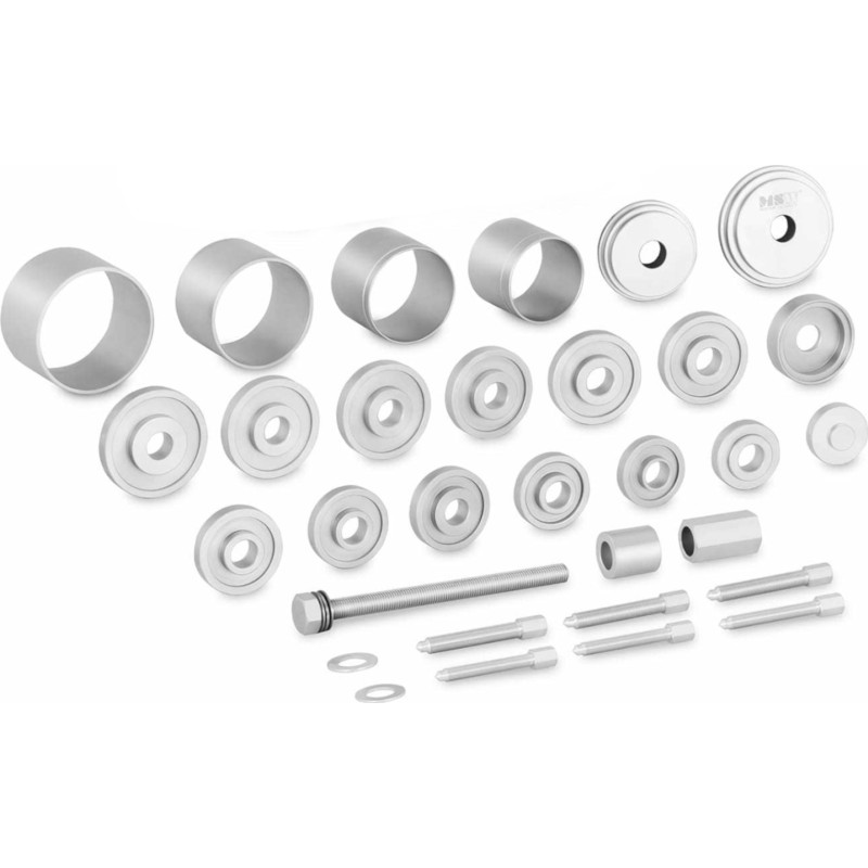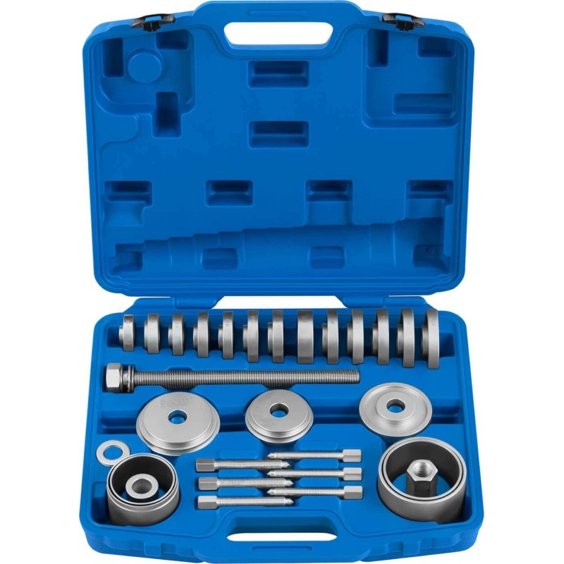 eignet sich sowohl für professionelle Kfz-Werkstätten als auch für Heimwerker-Garagen. Es ermöglicht die schnelle und einfache Demontage/Montage der Vorderradnabe und ihrer Lager. Das Gerät ist aus strapazierfähigem Stahl mit Korrosionsschutzbeschichtung gefertigt. Das gesamte Set befindet sich in einem praktischen Kunststoffkoffer.