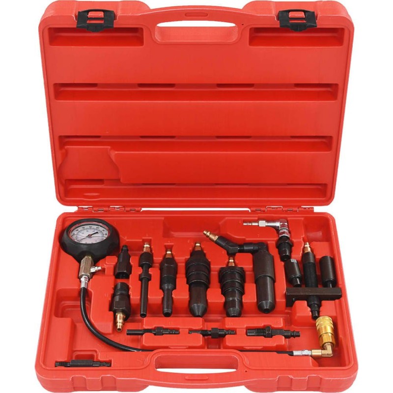 Dieses benutzerfreundliche Set zur Messung des Verdichtungsdrucks in Dieselmotoren enthält alle notwendigen Komponenten, um den Verdichtungsdruck in den meisten PKWs, LKWs und Traktoren mit Dieselmotor zu prüfen.