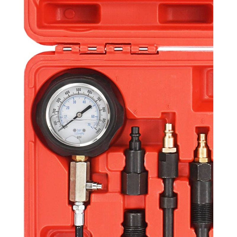 Der Kompressionstester ist aus robustem Kohlenstoffstahl gefertigt und verfügt über ein verchromtes Manometer, das auch unter schwierigen Bedingungen genaue Messungen ermöglicht. Das Messgerät hat einen Messbereich von 0–70 bar/0–1000 PSI.