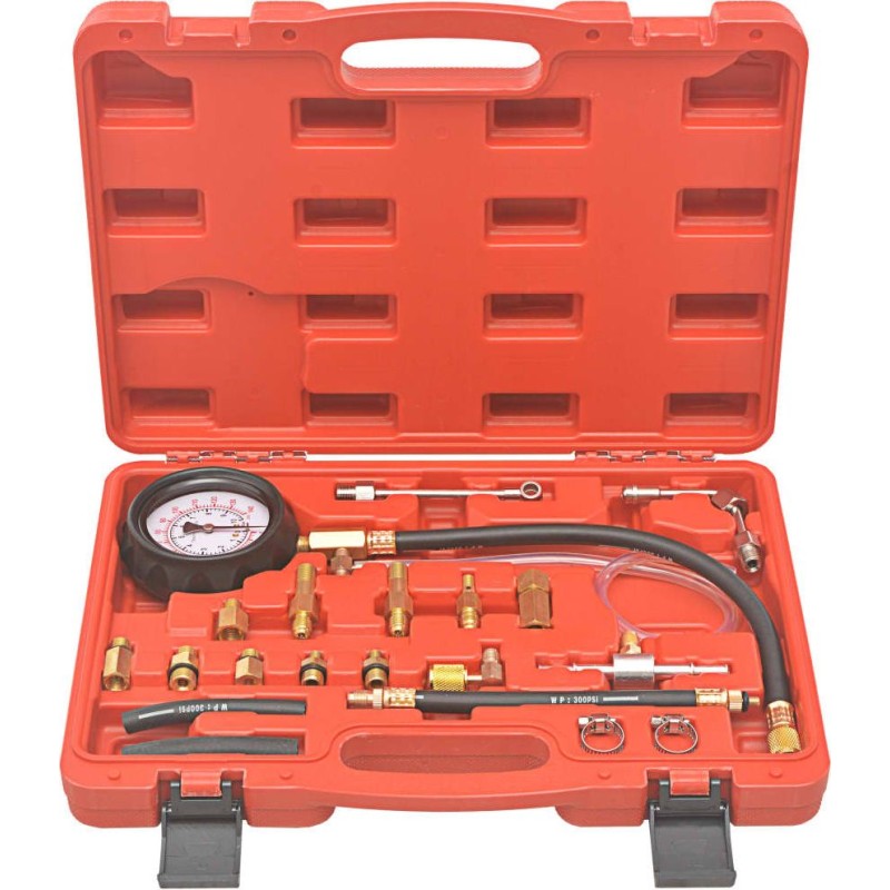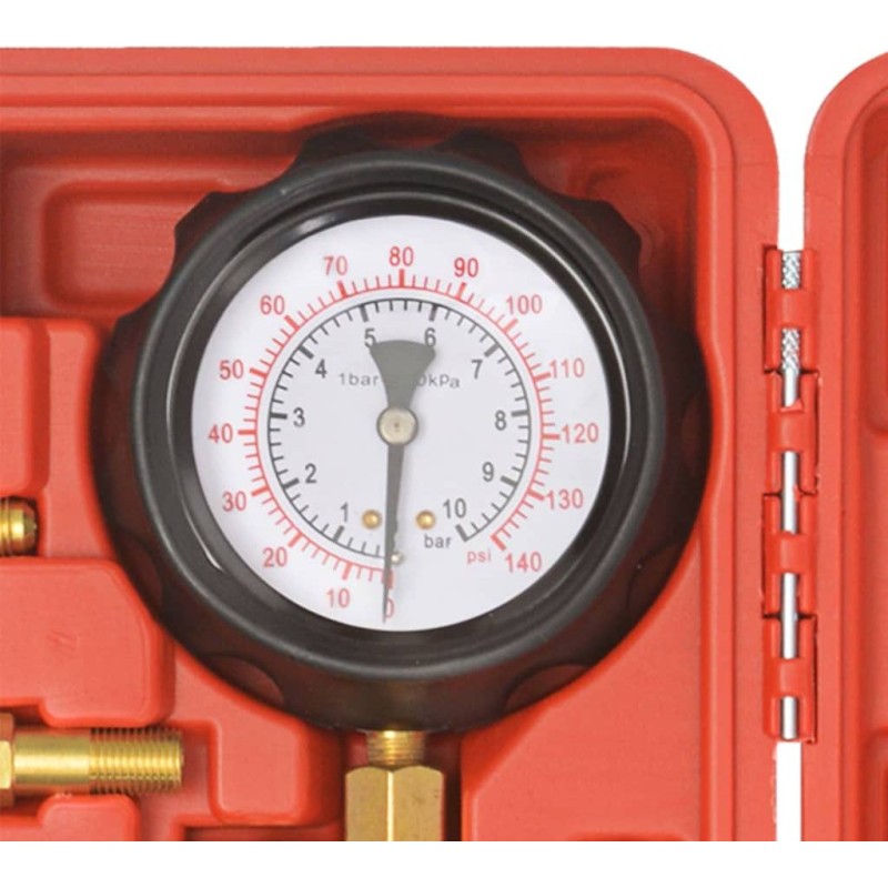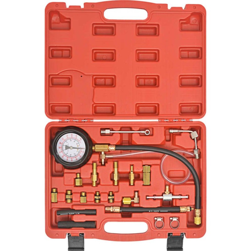 Dieses professionelle Messgerät für den Kraftstoffdruck im Einspritzsystem enthält Adapter, Schläuche, Klemmen und Anschlüsse, die für den Einsatz an mechanischen und elektronischen Benzineinspritzsystemen in den meisten PKWs und LKWs geeignet sind.
