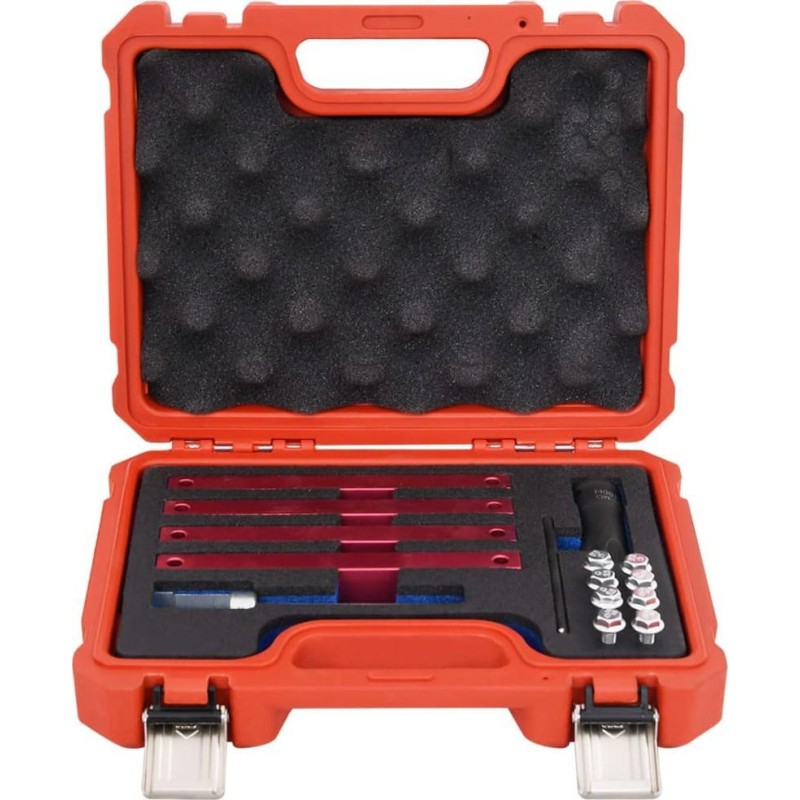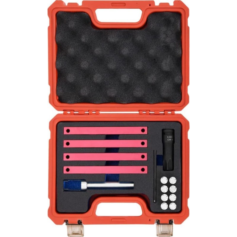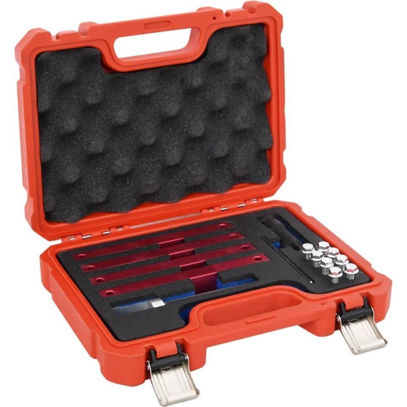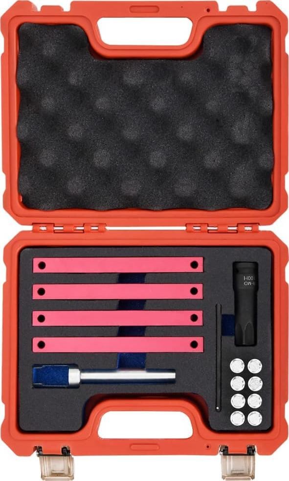 Dieses Set enthält die notwendigen Werkzeuge für Arbeiten am Ventiltrieb von Fahrzeugen der Marke Mercedes-Benz. Wenn bei einer Reparatur oder Überholung des Motors die Nocken der Nockenwelle demontiert und eingestellt werden müssen, muss die Nockenwelle in der entsprechenden Position arretiert werden. Die Werkzeuge im Set sind robust und langlebig. Sie werden in einem Koffer geliefert, der die Aufbewahrung und den Transport erleichtert.