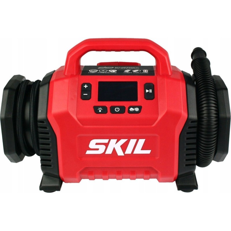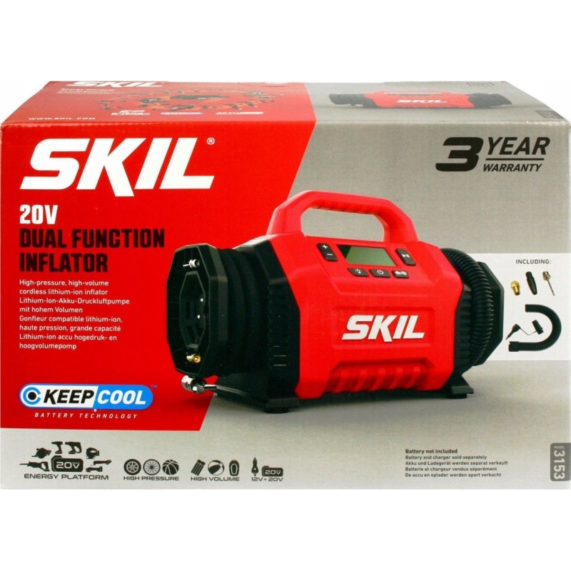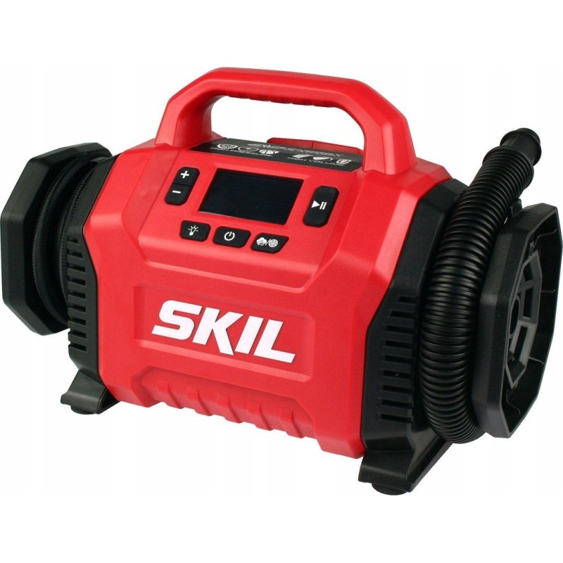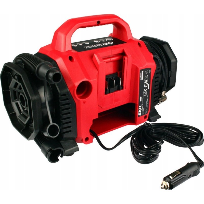 Zwei wählbare Stromquellen – Akkubetrieb mit einem 20V Max (18V) Lithium-Ionen-Akku von SKIL oder Betrieb über den 12V-DC-Zigarettenanzünder im Auto.