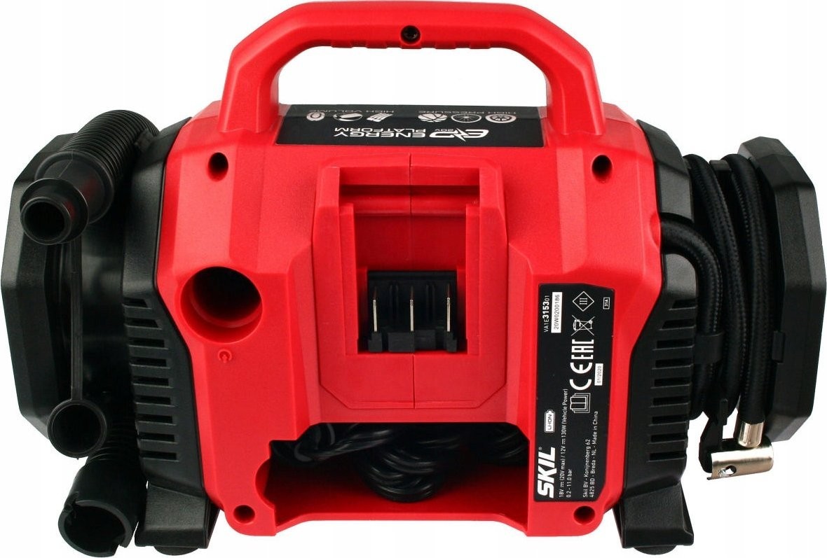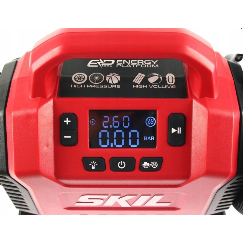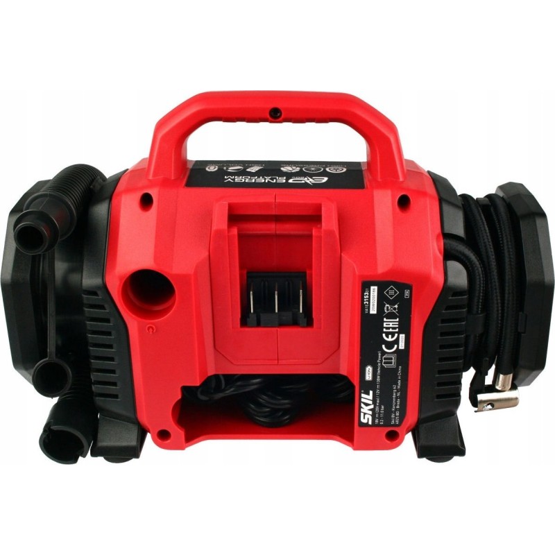 Als Stromquelle kann entweder ein 20V Max (18V) Akku von SKIL oder der 12-V-DC-Anschluss des Zigarettenanzünders im Auto verwendet werden.
