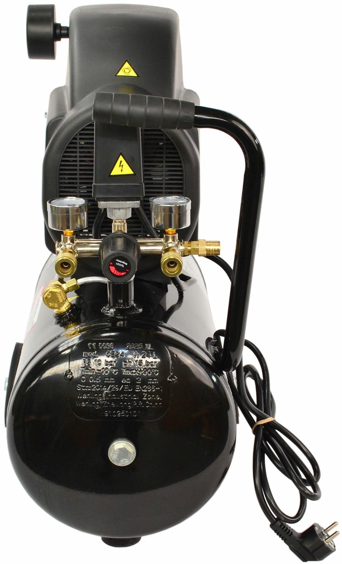 Eingebautes Manometer, Schnellkupplung und Druckminderer.