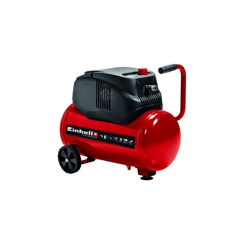 Einhell TC-AC 200/24/8 OF. Förderleistung: 180 l/min, Drehzahl des Pumpenmotors (maximal): 15.000 U/min, Maximaler Druck: 8 bar. Produktfarbe: Schwarz, Rot, Geeignet für: Universell, Anzahl der Räder: 2 Stück. Motorleistung: 1200 W, Stromversorgung: Wechselstrom, Eingangsspannung AC: 220–240 V. Produktgewicht: 16 kg, Gewicht inkl. Verpackung: 18,6 kg