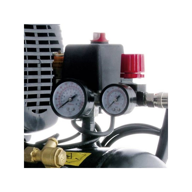 Mobile Kolbenkompressor mit ölgeschmiertem, direkt am Flansch montiertem 1-Zylinder-Aggregat mit Motorschutz. Mit Hartgummirädern und einer Gummiauflage an der Vorderseite. Die Kondensatablass erfolgt über ein Kugelventil. Großer Luftfilter für optimale Luftzufuhr. Ausgestattet mit einem Druckregler zur Einstellung des Betriebsdrucks.