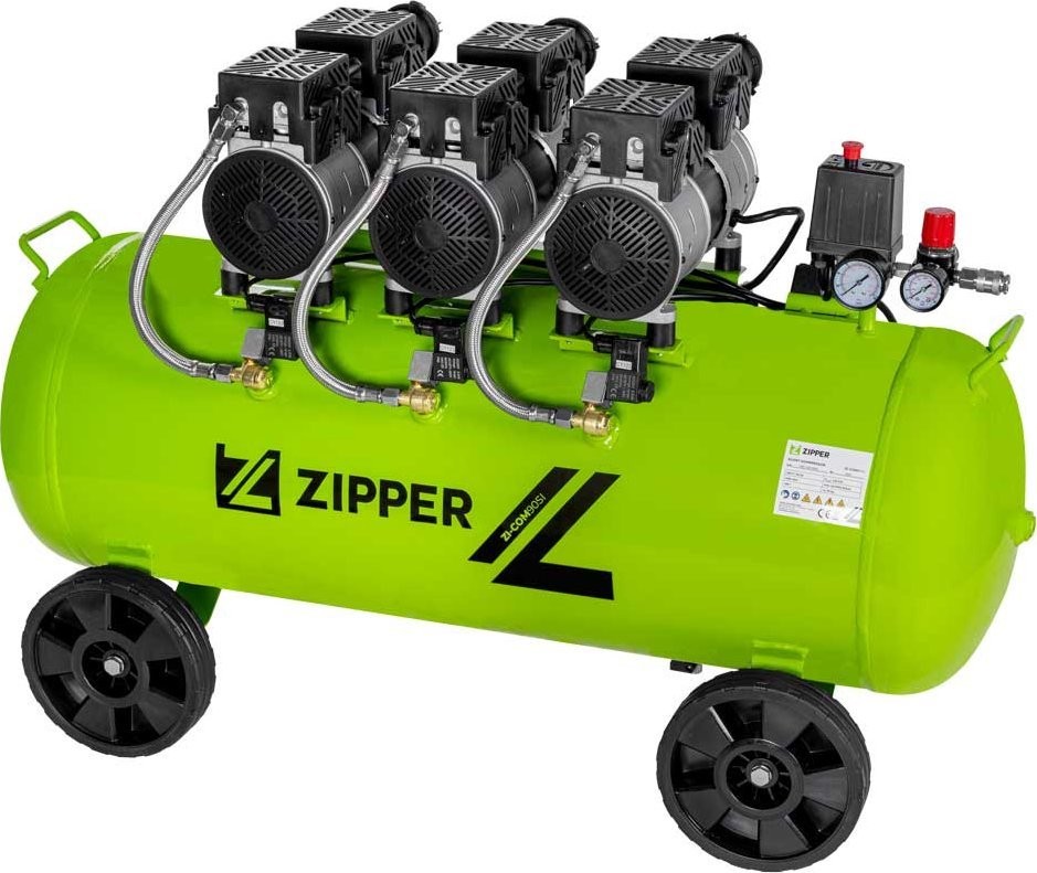 Zipper ZI-COM90SI. Leistung: 378 l/min, Maximaler Druck: 8 bar, Luftbehältervolumen: 90 l. Produktfarbe: Schwarz, Hellgrün, Anzahl der Räder: 2 Stück. Motorleistung: 2250 W, Stromversorgung: Wechselstrom, Eingangsspannung AC: 230 V. Produktbreite: 1020 mm, Produkttiefe: 415 mm, Produkthöhe: 695 mm