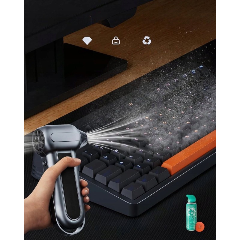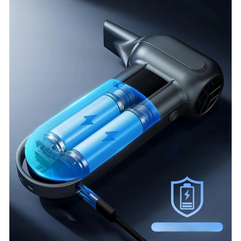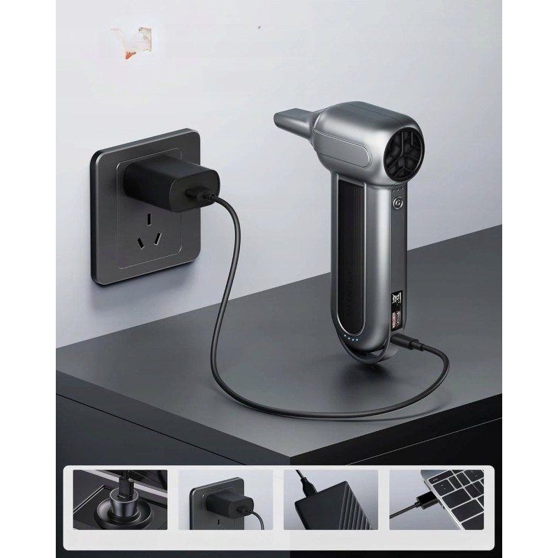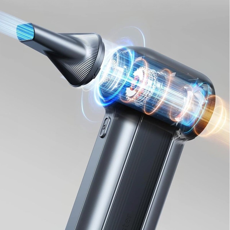 Der Kompressor WOLFBOX MF100 ist mit einem leistungsstarken Motor ausgestattet, der eine Drehzahl von 150.000 U/min erreicht. Diese Leistung erzeugt einen Luftstrom von über 45 m/s, was die Entfernung von Verschmutzungen und das schnelle Aufpumpen verschiedener Gegenstände erheblich erleichtert.