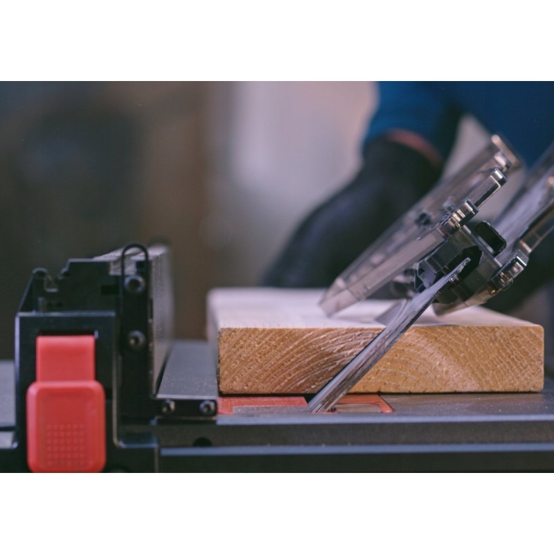 - Die werkzeuglose parallele Feineinstellung des Sägeblatts zur Führung gewährleistet, dass Führung und Sägeblatt stets perfekt parallel zueinander stehen.