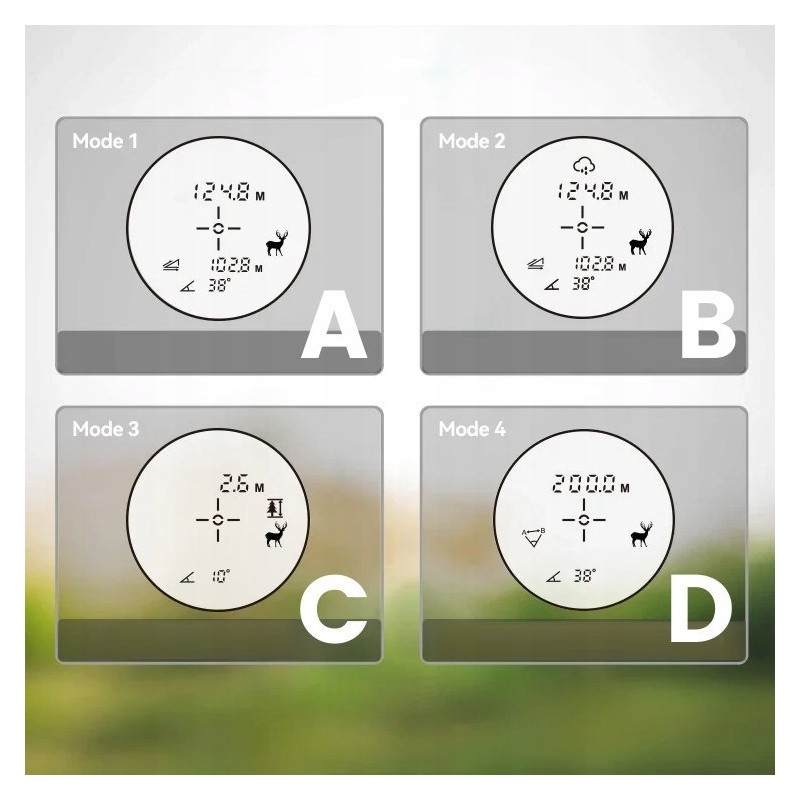 - Messmodi: Entfernung, Punkt-zu-Punkt-Entfernung, Messung bei Regen/Nebel, vertikale Höhe