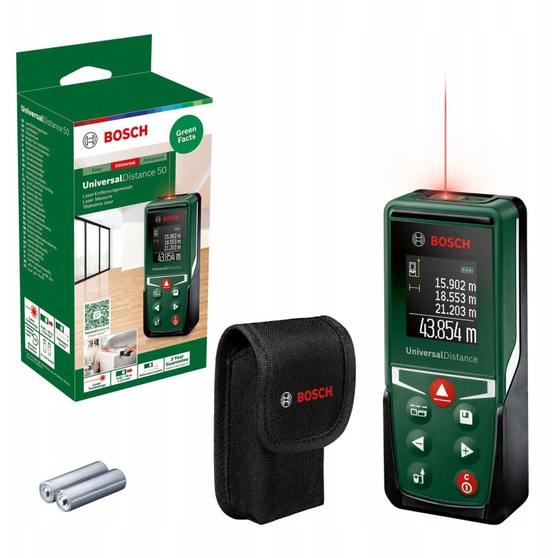 - Enthaltene Komponenten: UniversalDistance 50, 2 AAA-Batterien, Schutzhülle, Bedienungsanleitung, Kartonverpackung