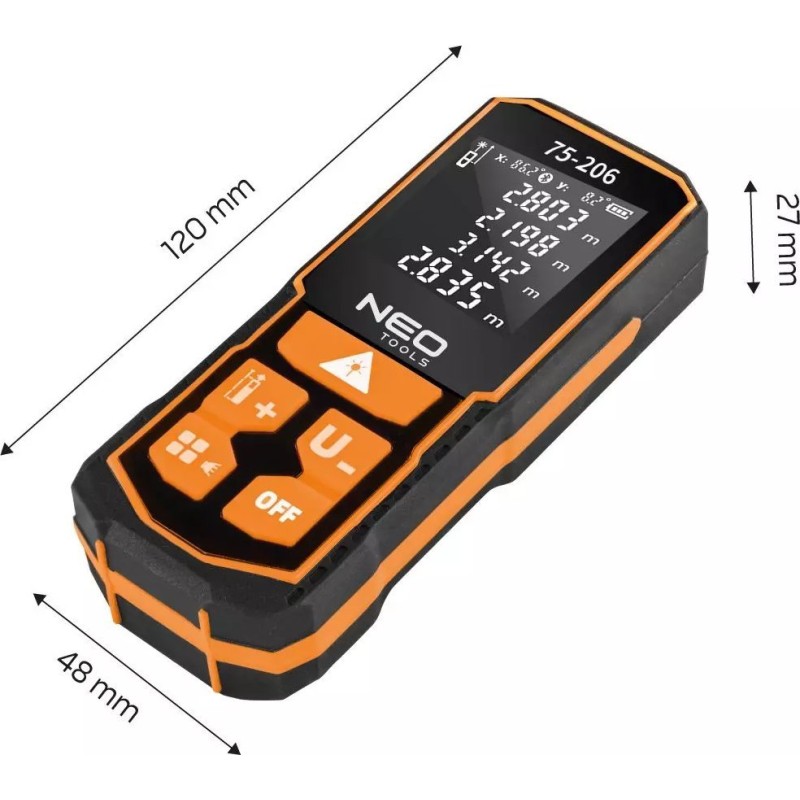 Die maximale Reichweite des Geräts beträgt 0,05 – 100 m, die Messgenauigkeit +/- 2 mm. Das Produkt eignet sich für den Einsatz im Bauwesen, in der Vermessungstechnik, bei technischen Projekten sowie im Haushalt. Das Gerät verfügt über die Schutzklasse IP54. Der Entfernungsmesser ist mit einem gut lesbaren Display ausgestattet und verfügt über eine einstellbare Lautstärke. Stromversorgung: 2xAA Ni-MH-Akkus oder 2 AA-Alkalibatterien. Das Produkt verfügt über ein CE-Zertifikat. Die Marke NEO erfüllt die Erwartungen von Profis.