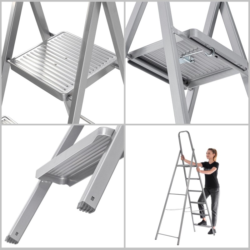 Funktional – Servey-Leitern eignen sich ideal für Aufräumarbeiten oder Renovierungen. Die Konstruktion des Produkts ermöglicht die Anbringung von Elementen wie Haken, und dank der breiten Plattform kannst du die bei der Arbeit verwendeten Werkzeuge mühelos ablegen.